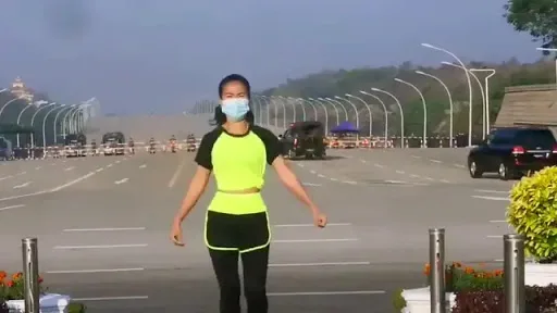 Seorang wanita merekam video latihan saat kudeta militer terjadi di belakangnya. Kamera Khing Hnin Wai menangkap konvoi yang sedang melewati barikade menuju parlemen di Myanmar, yang dulu dikenal sebagai Burma.