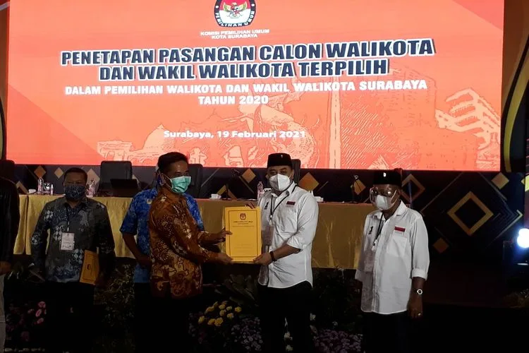 “Memutuskan, menetapkan pasangan calon wali kota dan wakil wali kota Surabaya nomor urut 1, saudara Eri Cahyadi-Armuji, sebagai pasangan calon wali kota dan wakil wali kota terpilih dalam Pilkada Surabaya 2020, dengan perolehan suara 597.540 atau 56,94 persen dari total suara sah,” kata Komisioner KPU Surabaya Divisi Hukum dan Pengawasan, Agus Turcham, pada Rapat Pleno Terbuka Penetapan Pasangan Calon Wali Kota dan Wakil Wali Kota Terpilih dalam Pilkada Surabaya 2020.