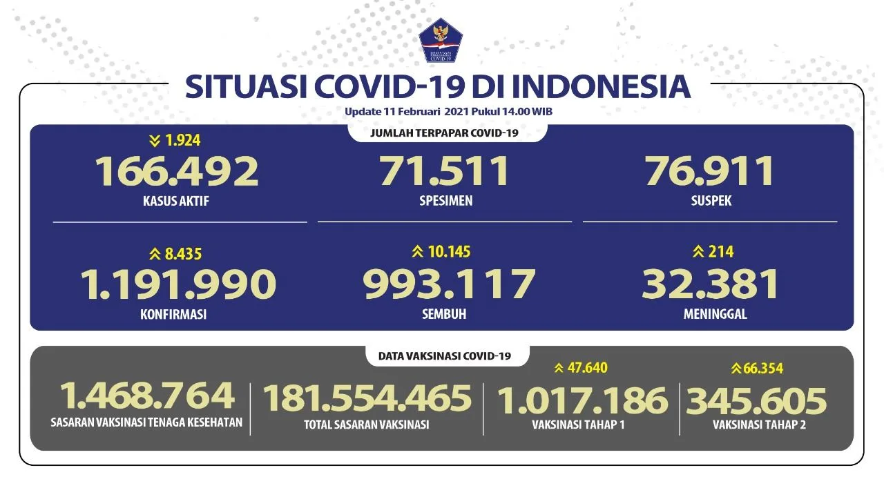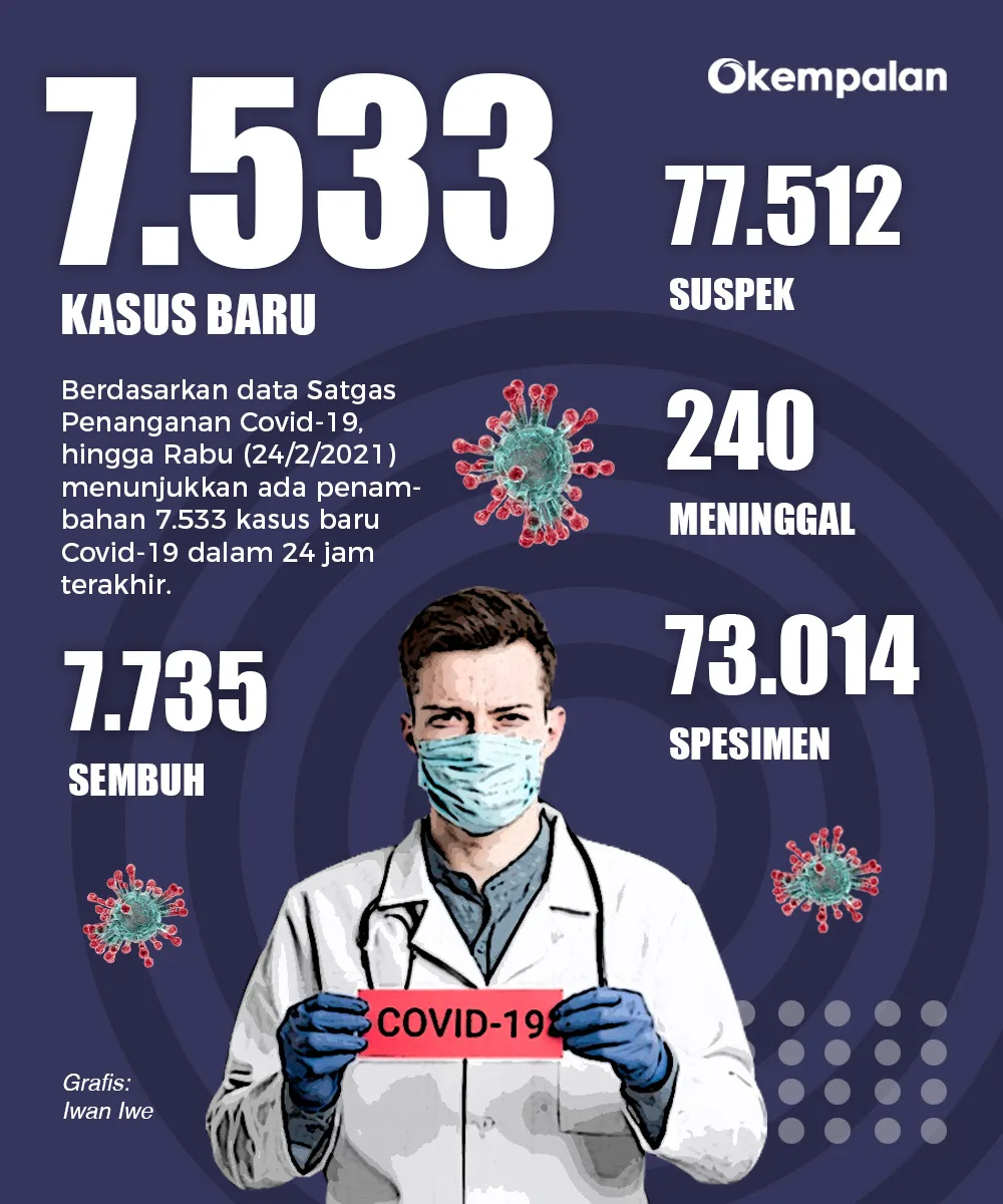 JAKARTA-KEMPALAN: Kasus positif Covid-19 di Tanah Air, berdasarkan data Senin 22 Februari 2021, bertambah 10.180. Dengan penambahan itu, total kasus infeksi virus Corona di Indonesia sudah lebih dari 1,2 juta kasus atau sebanyak 1.288.833.