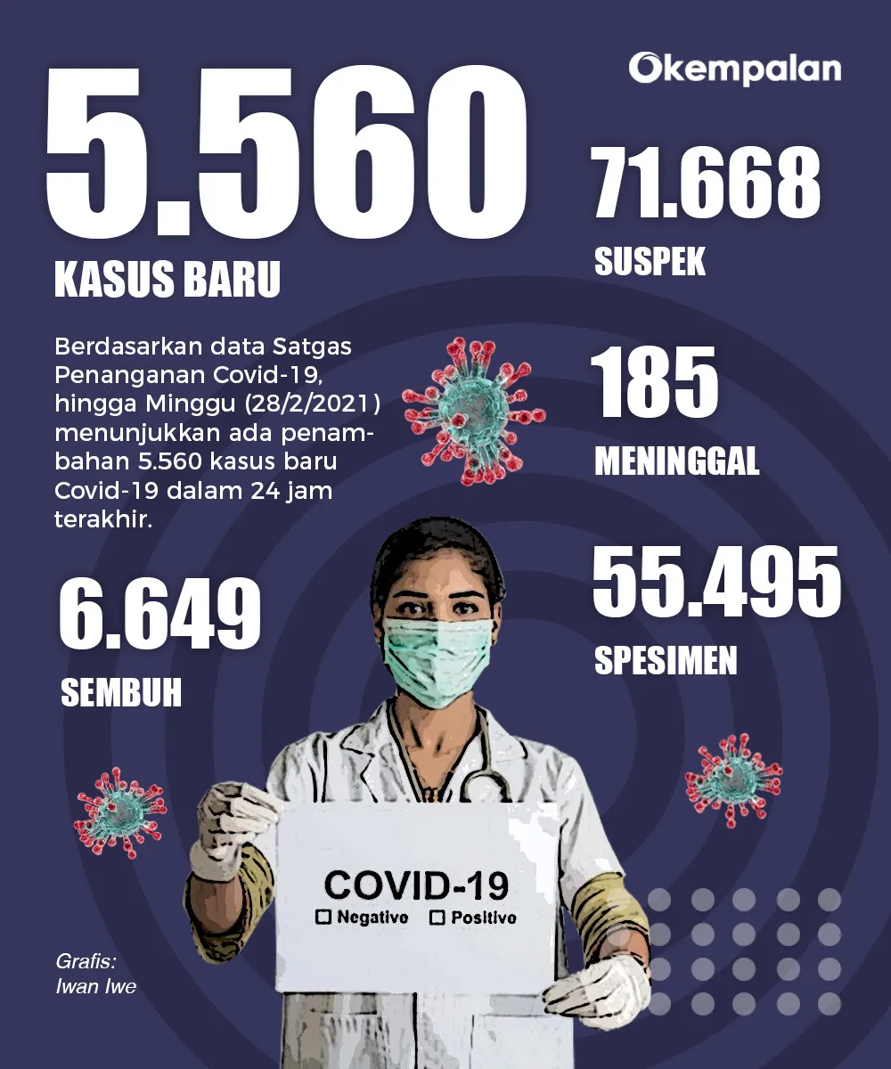 JAKARTA-KEMPALAN: Jumlah kasus konfirmasi positif virus Corona COVID-19 di Indonesia bertambah 5.560 kasus pada Minggu (28/2). Total kasus sebanyak 1.334.634, sembuh 1.142.703, dan meninggal 36.166.