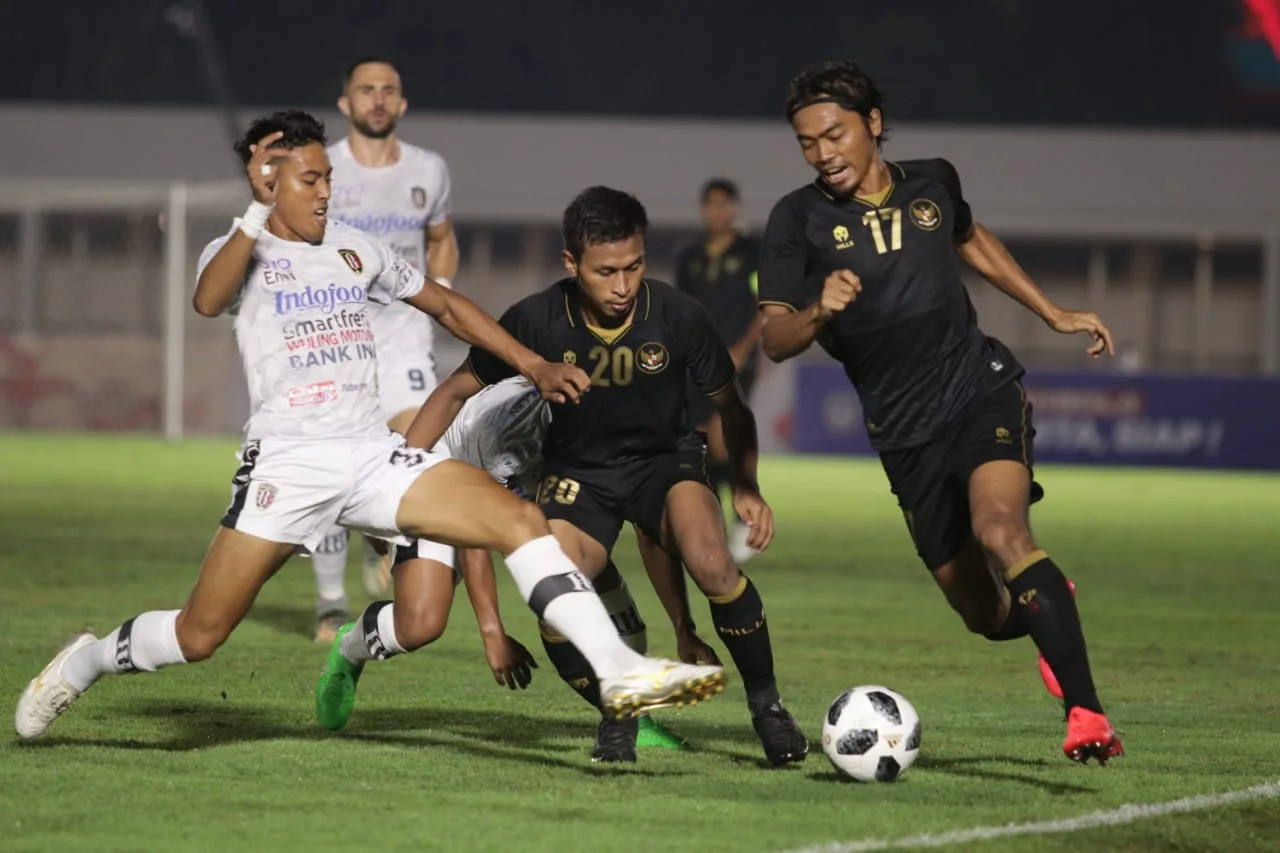 JAKARTA, KEMPALAN: Laga antara tim Indonesia U-23 dan Bali United di Stadion Madya, Senayan, Jakarta, Minggu (7/3) malam berjalan ketat. Beberapa pemain yang tidak diturunkan pada laga pertama (5/3) melawan PS Tira Persikabo (5/3) kali ini diturunkan oleh pelatih Shin Tae-yong. Seperti Evan Dimas Darmono dan Osvaldo Ardiles Haay.