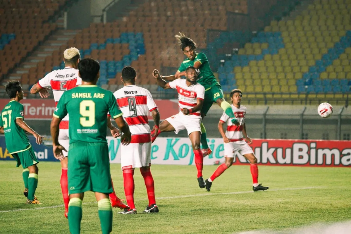 KEMPALAN: Di luar dugaan Persebaya Surabaya mampu mengungguli skuad Madura United. Padahal sebagaimana diketahui Persebaya bermaterikan pemain lokal, sementara Madura United komplit dengan empat pemain asingnya.