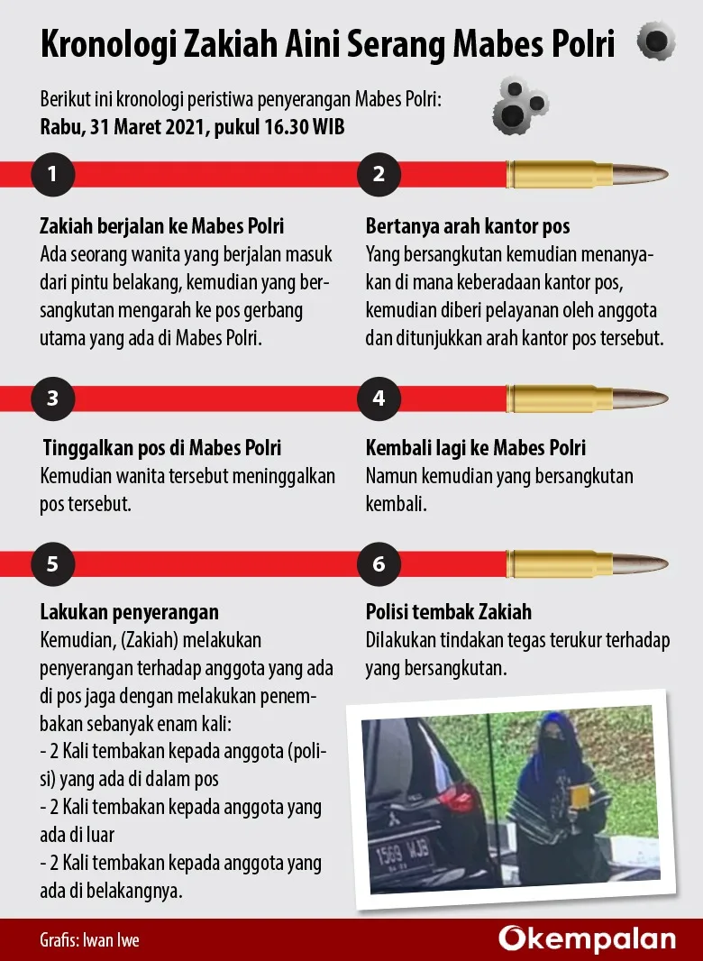 Dalam video amatir yang beredar diketahui, perempuan terduga pelaku teroris masuk ke dalam areal Mabes Polri mendekati pintu gerbang depan yang dikhususkan bagi pintu masuk pimpinan Polri. Setelah itu, terduga teroris itu mengacungkan pistol dan menembakkan peluru. Setelah beberapa kali tembakan, pelaku berhasil dilumpuhkan oleh petugas kepolisian.