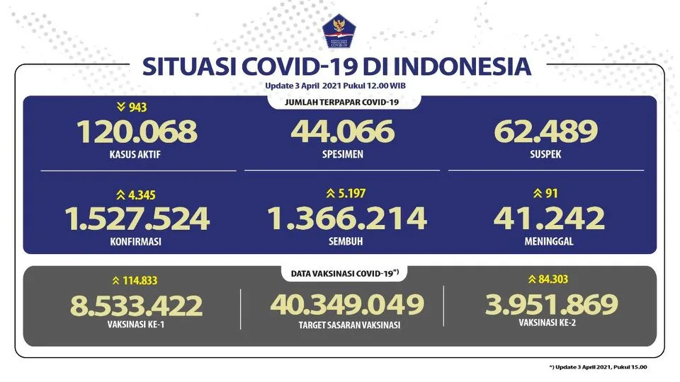 Berdasarkan data pemerintah pada 1 April 202, terjadi penambahan 6.142 kasus baru dengan jumlah kasus aktif 121.222 atau persentasenya 8 persen dibandingkan rata-rata dunia 17,2 persen. Sementara itu, jumlah total kesembuhan sebanyak 1.355.578 kasus atau 89,3 persen dibandingkan rata-rata dunia 80,7 persen.
