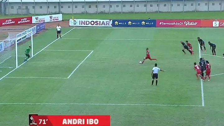 Andri Ibo melepas tembakan penalti kencang yang mampu mengecoh M. Ridwan sebagai kiper. Skor berubah imbang 1-1.