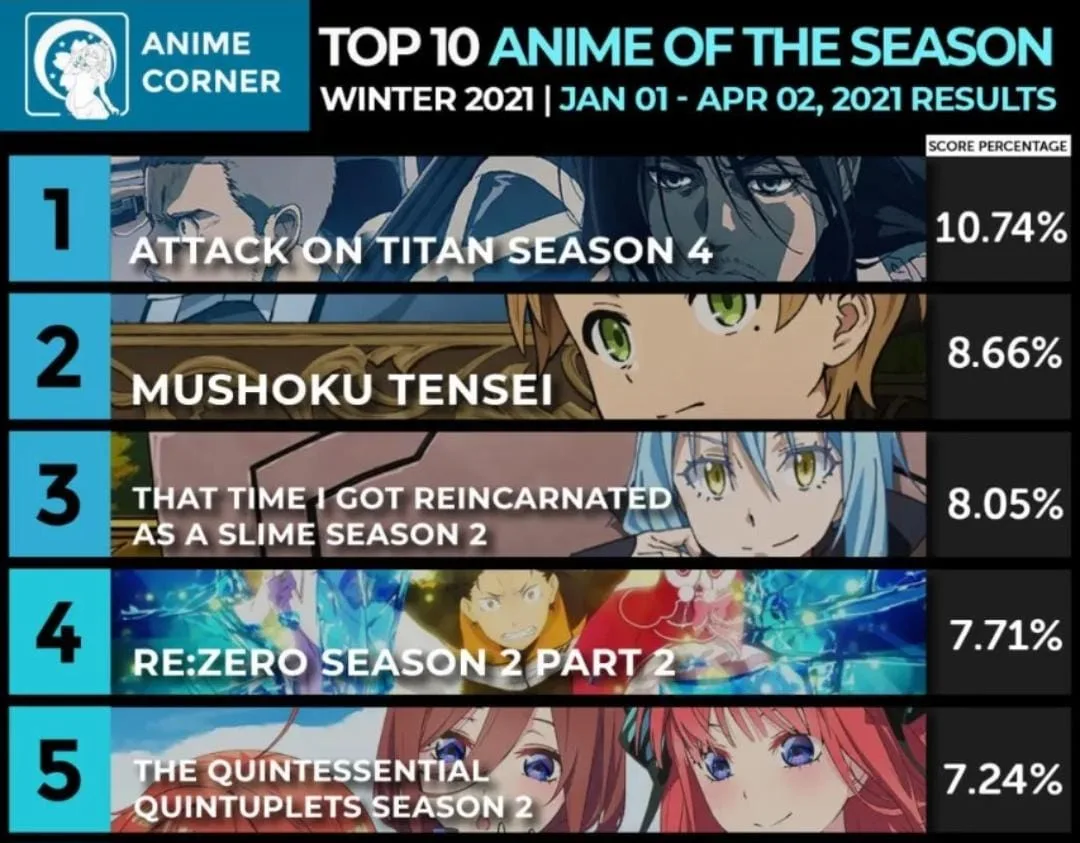 Attack on Titan menjadi peringkat teratas dengan presentase 10.74% dari pemeringkatan anime terbaik season Winter 2021 karena secara umum anime ini memang menyuguhkan cerita yang mendebarkan didampingi dengan visual yang cukup ciamik.