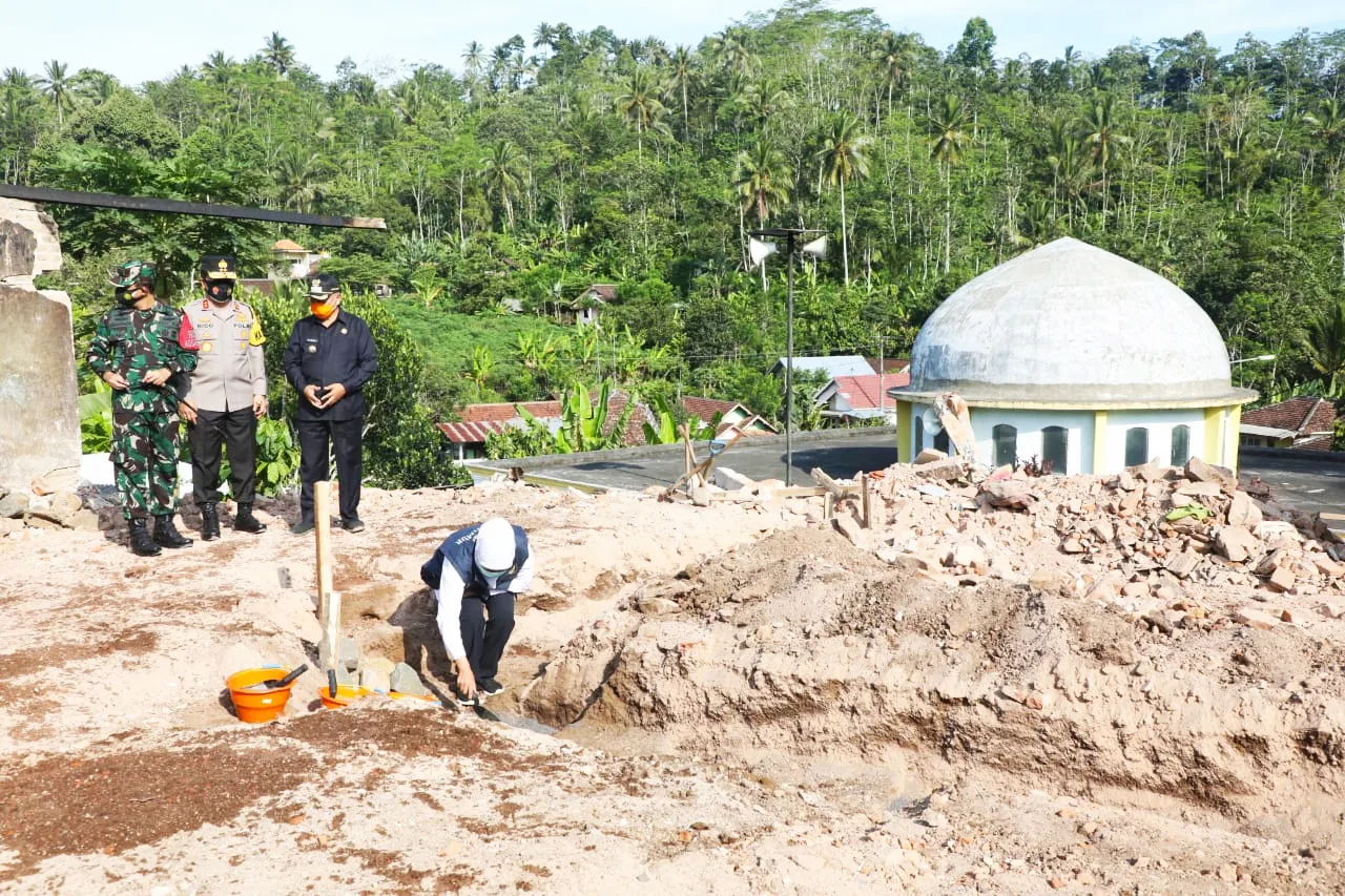 MALANG-KEMPALAN: Sepekan usai terjadinya Gempa 6,1 SR pada Sabtu (10/4) lalu, Gubernur Jatim Khofifah Indar Parawansa bersama Kapolda Jatim Irjen Pol. Nico Afinta dan Pangdam V Brawijaya Mayjen TNI Suharyanto melakukan peletakan batu pertama pembangunan rumah sementara di lokasi terdampak gempa yang ada di Desa Jogomulyan, Kecamatan Tirtoyudo, Kab. Malang, Sabtu (17/4).