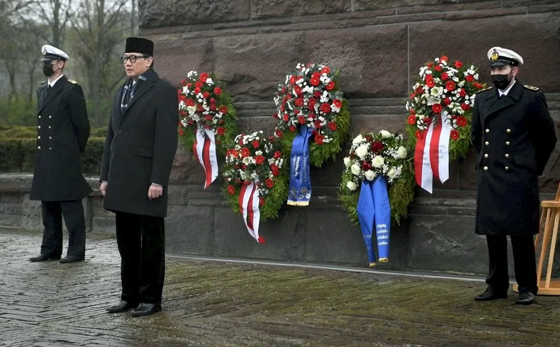 BERLIN-KEMPALAN: Duta Besar RI untuk Jerman Arif Havas Oegroseno menghadiri acara penghormatan terakhir kepada kru KRI Nanggala 402 di Monumen Kapal Selam kota Möltenort, Jerman, Kamis (29/4). Acara ini digelar Asosiasi Awak Kapal Selam Jerman atau Verband Deutscher Ubootfahrer (VDU) yang sekaligus upacara peletakan karangan bunga.