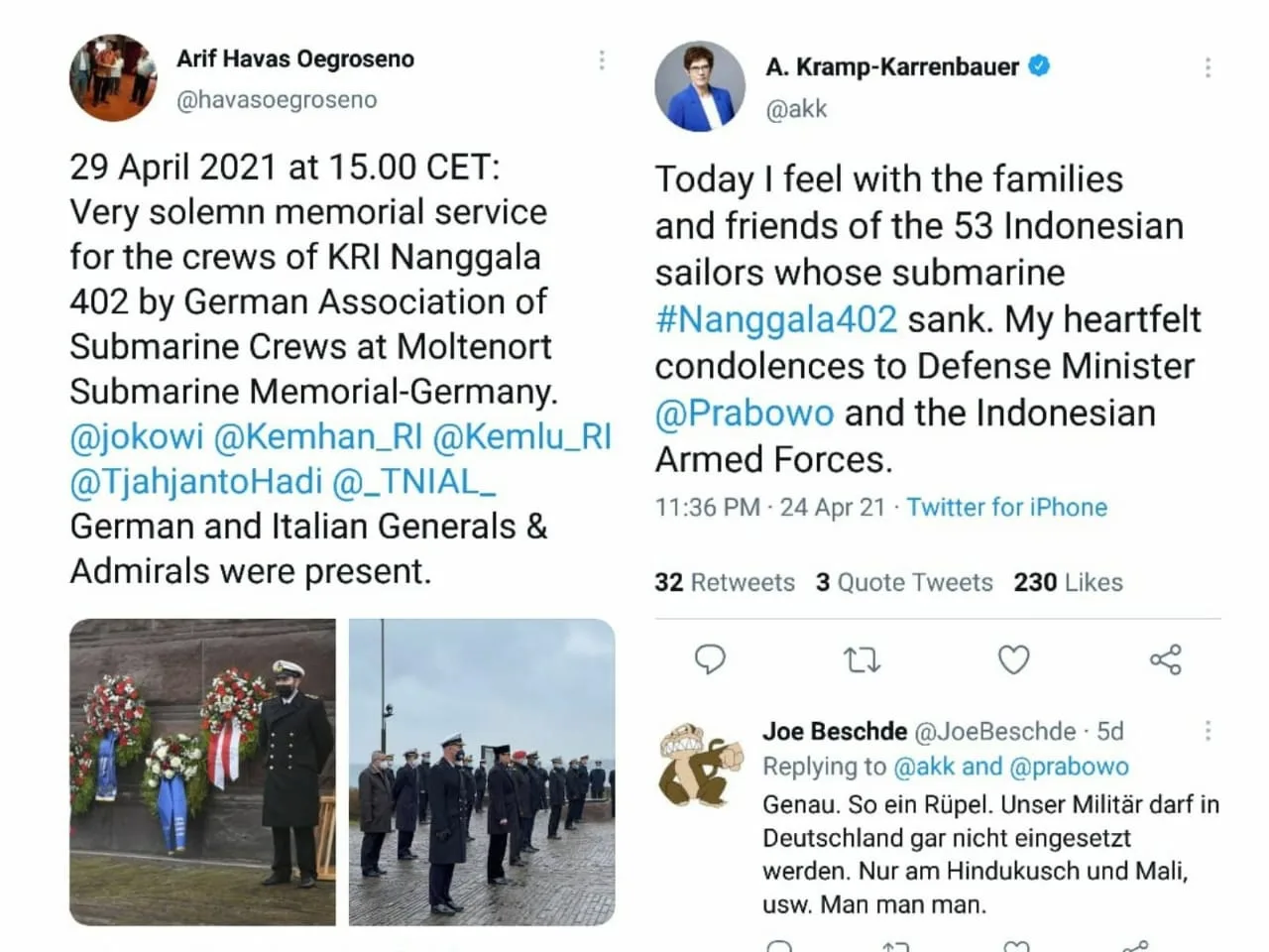 Dalam twitt-nya, Dubes Arif Havas juga menyebut kehadiran para purnawirawan perwira tinggi Jerman serta Italia di acara tersebut. Sebelumnya, Menteri Pertahanan Jerman Annegret Kramp-Karrenbauer juga telah menyampaikan duka mendalam atas musibah yang menimpa KRI Nanggala 402, Sabtu (24/4).
