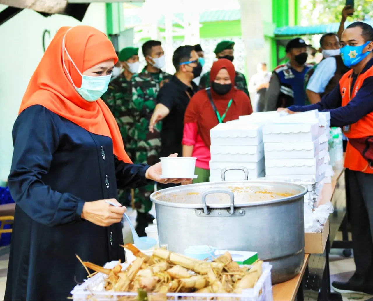 Sebelum menikmati ketupat sayur dan lepet bersama-sama, Gubernur Khofifah menyempatkan diri untuk meninjau lokasi dapur umum yang didirikan di Asrama Haji Surabaya. Khofifah juga menyempatkan diri berdialog dengan beberapa PMI.