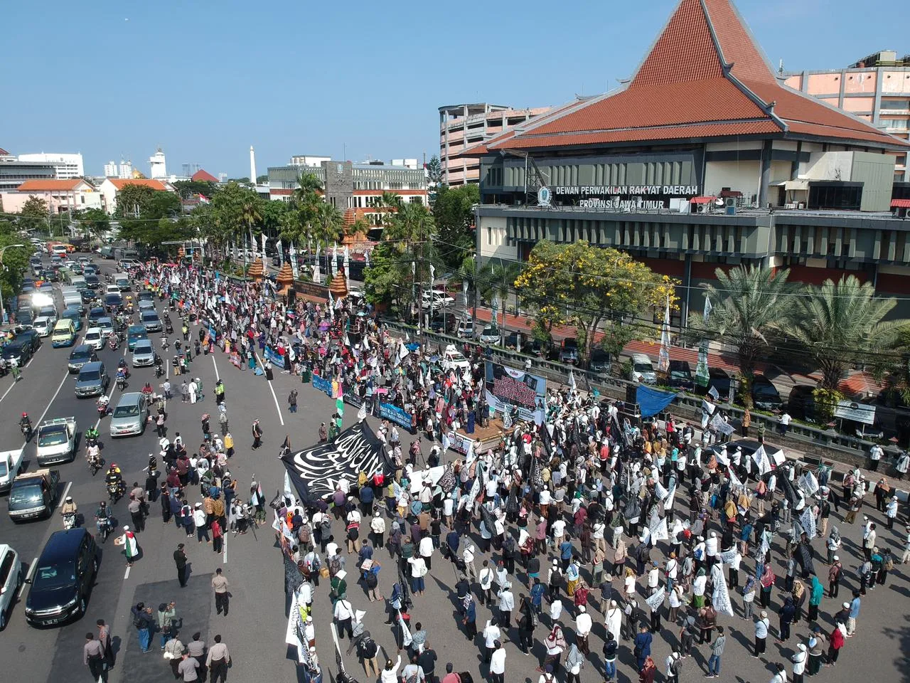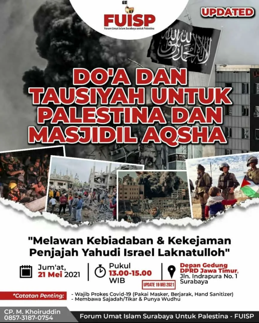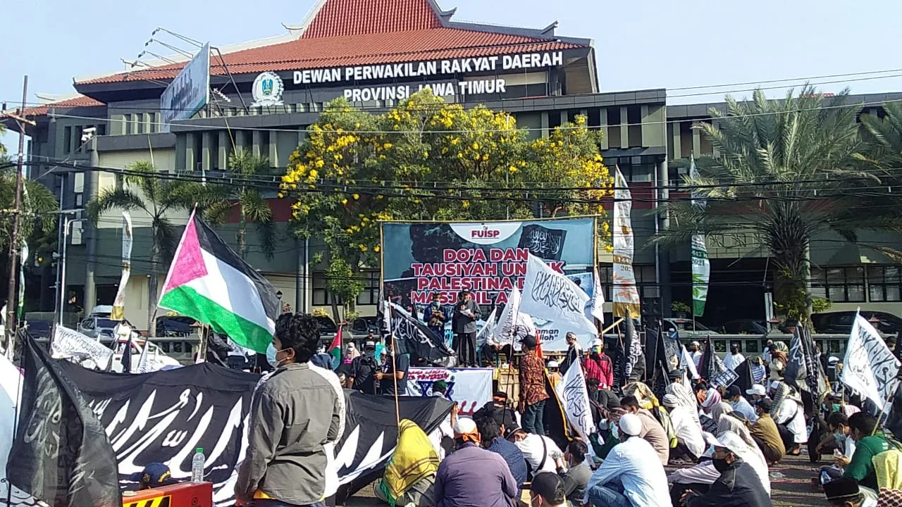 SURABAYA-KEMPALAN: Pada Jumat (21/5) Forum Umat Islam Surabaya untuk Palestina (FUISP) adakan Doa dan Tausiyah untik Palestina dan Masjidil Aqsa di depan gedung DPRD Provinsi Jawa Timur.