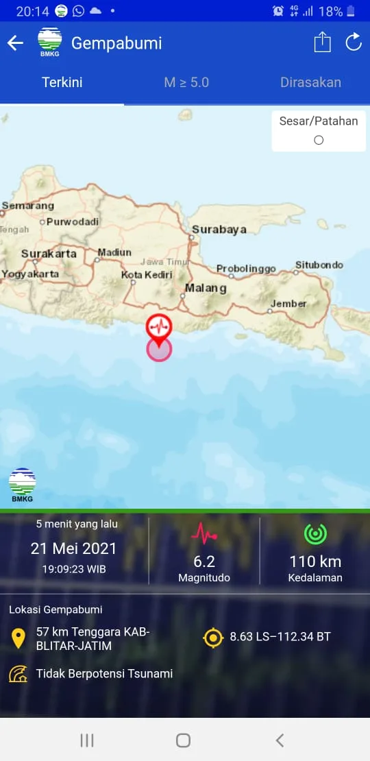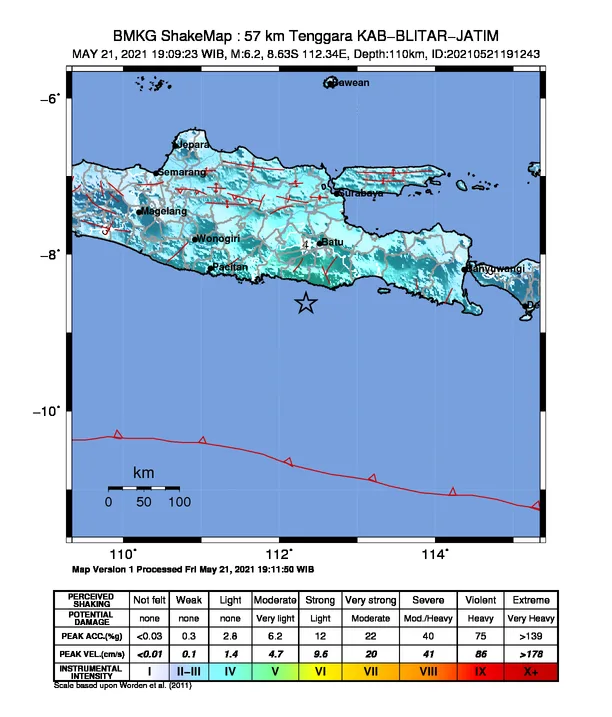 Dilansir dari laman www.bmkg.go.id, Gempabumi terjadi pukul 19:09 WIB dengan kekuatan 6,2 SR. Pusat gempa berada di 57 km Tenggara Kabupaten Blitar dengan kedalaman 110 km.