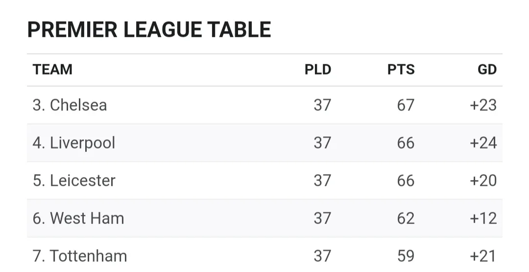 Jika Liverpool dan Chelsea menang, maka Leicester harus menang lebih dari 5 gol dari Tottenham untuk bisa naik kembali ke empat besar.