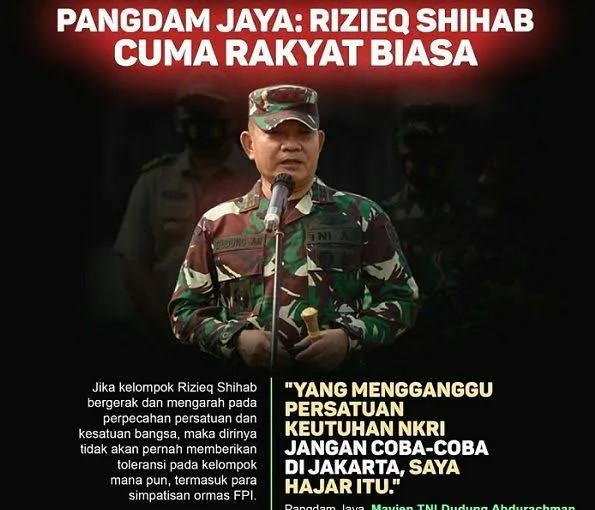 Misal, tantangan kerasnya pada Habib Rizieq Shihab, “Yang mengganggu persatuan, NKRI, jangan coba-coba di Jakarta, saya hajar itu.” Atau narasi lain yang disampaikannya, “Ini negara hukum, harus taat, masang baliho udah jelas aturannya, ada bayar pajak, dan tempat ditentukan, jangan seenaknya sendiri, seakan dia paling benar, jangan coba-coba pokoknya. Kalau perlu, FPI bubarkan saja itu. Kalau coba-coba dengan TNI, mari,” tantangnya. Tantangan yang sungguh menyelisih TNI hasil reformasi.