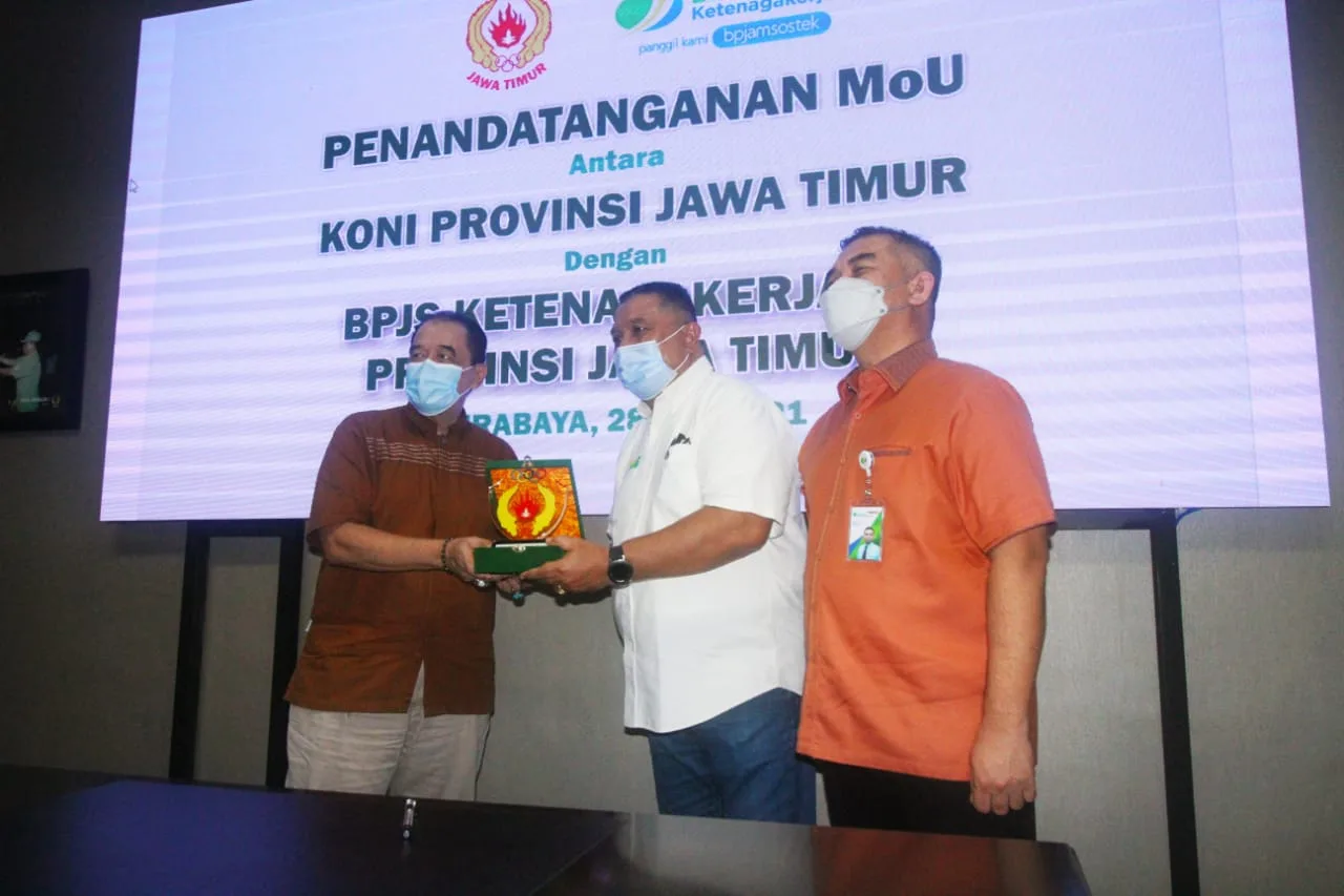 SURABAYA-KEMPALAN: Komite Olahraga Nasional Indonesia (KONI) Jawa Timur melakukan penandatanganan Memorandum of Understanding (MoU) dengan Badan Penyelenggara Jaminan Sosial (BPJS) Ketenagakerjaan Jawa Timur di Gedung KONI Jatim, Surabaya, Jumat, 28 Mei 2021.