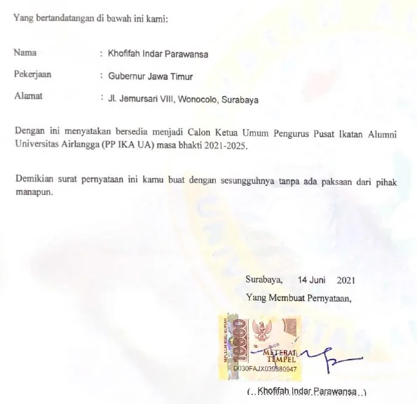 Sayangnya, klaim Yuliati ini tak berbalas. Sebuah surat bermaterai dan bertanda tangan Khofifah Indarparawansa beredar di sejumlah grup perpesanan WhatsApps. Surat itu menyatakan kesediaan Ketua Umum Muslimat NU sebagai calon Ketua Umum PP IKA Unair masa bhakti 2021-2025. “Dengan ini menyatakan bersedia menjadi Calon Ketua Umum Pengurus Pusat Ikatan Alumni Universitas Airlangga (UA) masa bhakti 2021-2025.” begitu bunyi yang tertulis dalam surat itu.