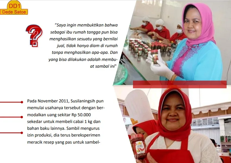 SURABAYA-KEMPALAN: Rabu (16/6) malam Kempalan.com telah mewawancarai Dra.Susilaningsih, MM (66) pemilik sekaligus direktur UD, Dede Satoe Surabaya. Dede Satoe sendiri adalah Industri Kecil Sambal Rumahan yg siap saji dan tersedia dalam berbagai varian rasa. Dede Satoe berdiri sejak November 2011 di Surabaya Indonesia. Menggunakan bahan baku yang tersedia di Surabaya dan sekitarnya mulai dari mengolah 1kg cabai hingga sekarang dapat mengolah 150kg cabai perhari.