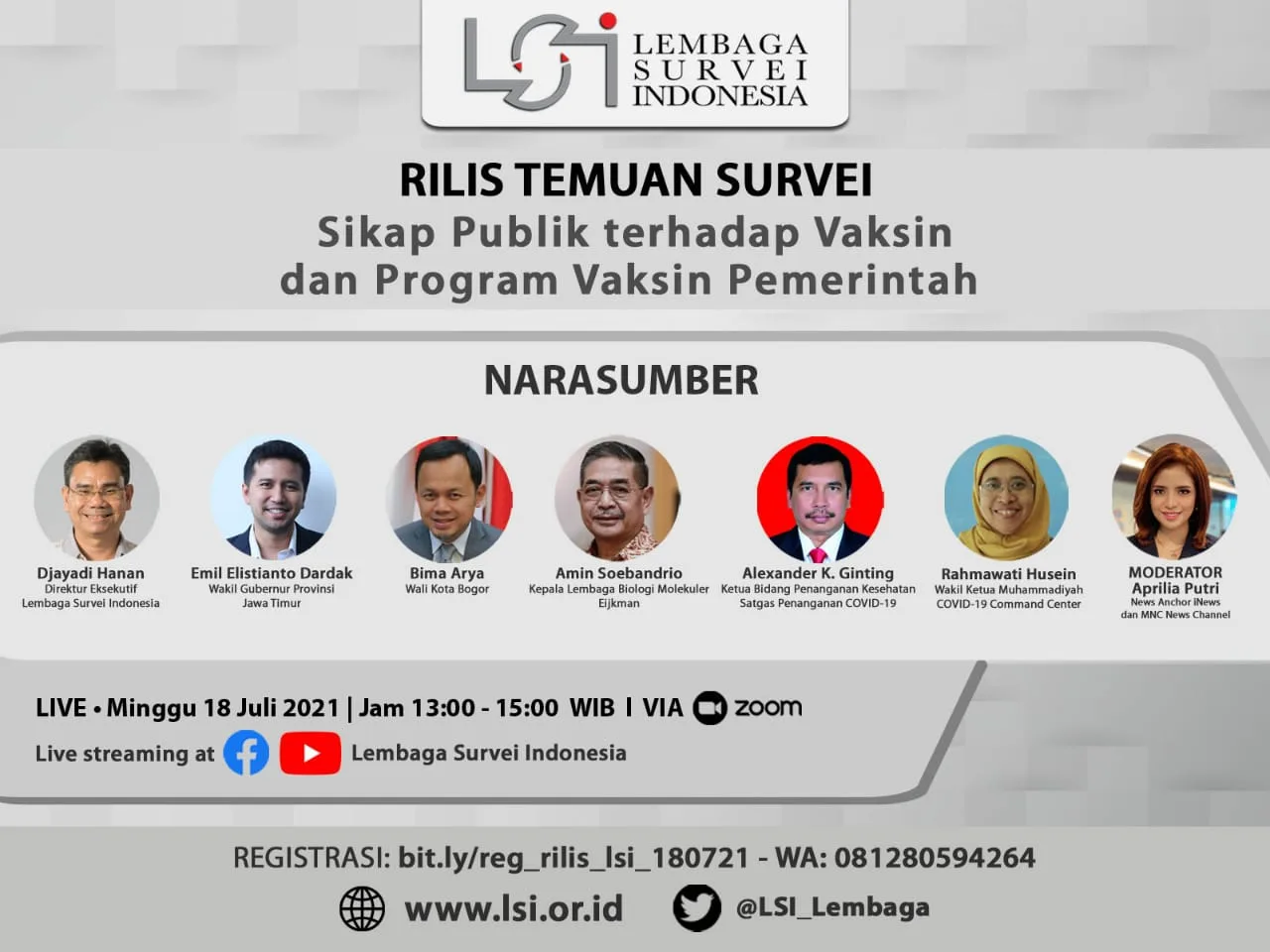 Dalam perilisan hasil surveynya, LSI turut mengundang narasumber terkemuka pada Sabtu (18/7) melalui online zoom meeting di antaranya, Djayadi Hanan sebagai Direktur Eksekutif Lembaga Survei Indonesia, Emil Elistianto Dardak sebagai Wakil Gubernur Provinsi Jawa Timur, Bima Arya sebagai Wali Kota Bogor, Amin Soebandrio sebagai Kepala Lembaga Biologi Molekuler Eijkman, Alexander K. Ginting sebagai Ketua Bidang Penanganan Kesehatan Satgas Penanganan COVID-19 dan Rahmawati Husein sebagai Wakil Ketua Muhammadiyah COVID-19 Command Center serta moderator Aprilia Putri sebagai News Anchor iNews dan MNC News Channel.
