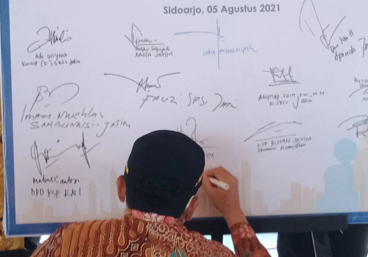 Komitmen tersebut ditandai dengan penandatanganan deklarasi gotong royong bersama Kadin Jatim, Apindo Jatim dan pimpinan konfederasi SP/SB Jatim.