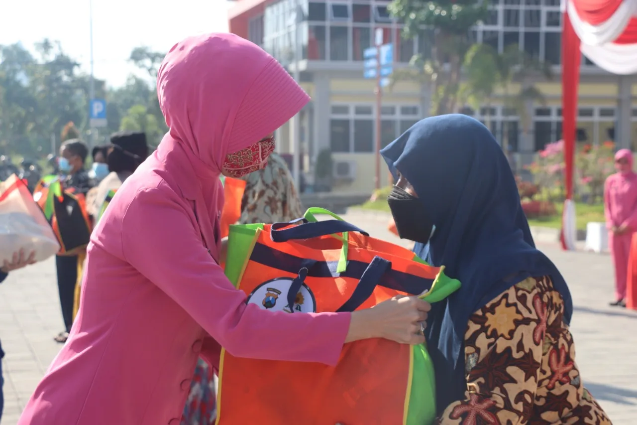 GRESIK-KEMPALAN : Memeringati Hari Kesaturan Gerak Bhayangkari (HKGB) ke 69 dan HUT Polwan RI ke 73, polisi bersama bhayangkari di Kabupaten Gresik menggelar bhakti sosial (Baksos), Rabu (4/8/2021). Ratusan paket sembako dibagikan kepada masyarakat terdampak Covid-19.