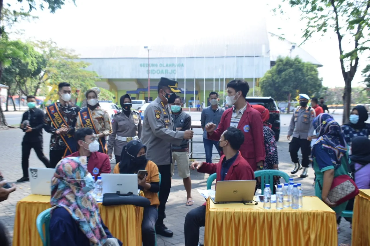 Untuk mensukseskan program ini, suntikan vaksin selain dilakukan Urkes Polresta Sidoarjo juga melibatkan mahasiswa dari Himipunan Mahasiswa Islam (HMI) Sidoarjo, yang membantu screening dan input data peserta vaksin.
