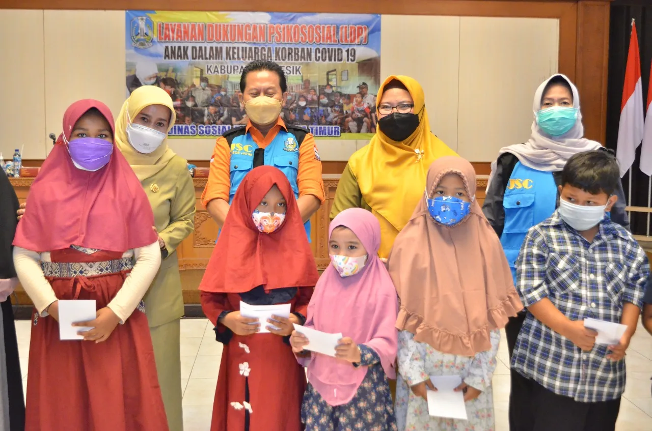 Selain memberi bantuan secara pribadi Bu Min, Panggilan akrab Wabup Gresik menjelaskan Para anak yang kehilangan orang tua akibat covid ini juga menerima sejumlah bantuan dari berbagai pihak. UPT Perlindungan Rehabilitasi Sosial Marsudi Putra (PRSMP) Surabaya.