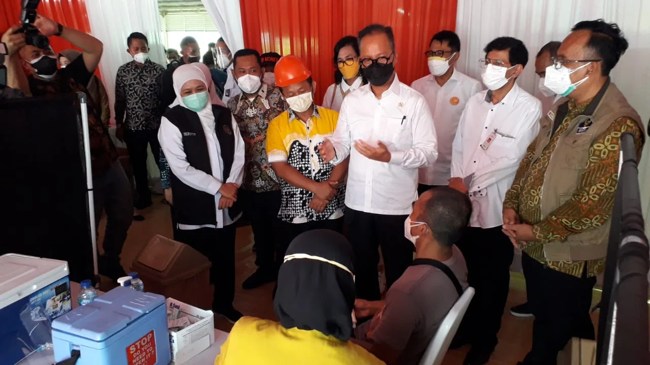 GRESIK-KEMPALAN: Menteri Perindustrian RI, Agus Gumiwang Kertsasmita meninjau langsung vaksinasi untuk para tenaga kerja di sektor industri PT Smelting Indonesia Gresik, Kamis (12/8).
