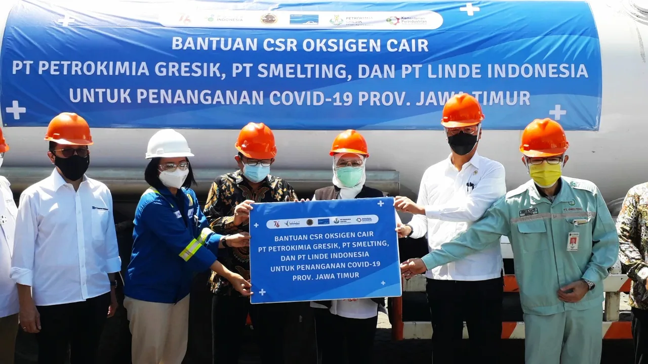Selain vaksinasi untuk para tenaga kerja, PT Smelting juga menyerahkan bantuan 50 ton Liquid Oksigen Medic (LOM) kepada Pemprov Jatim. Penyerahan dilangsungkan di PT Linde.