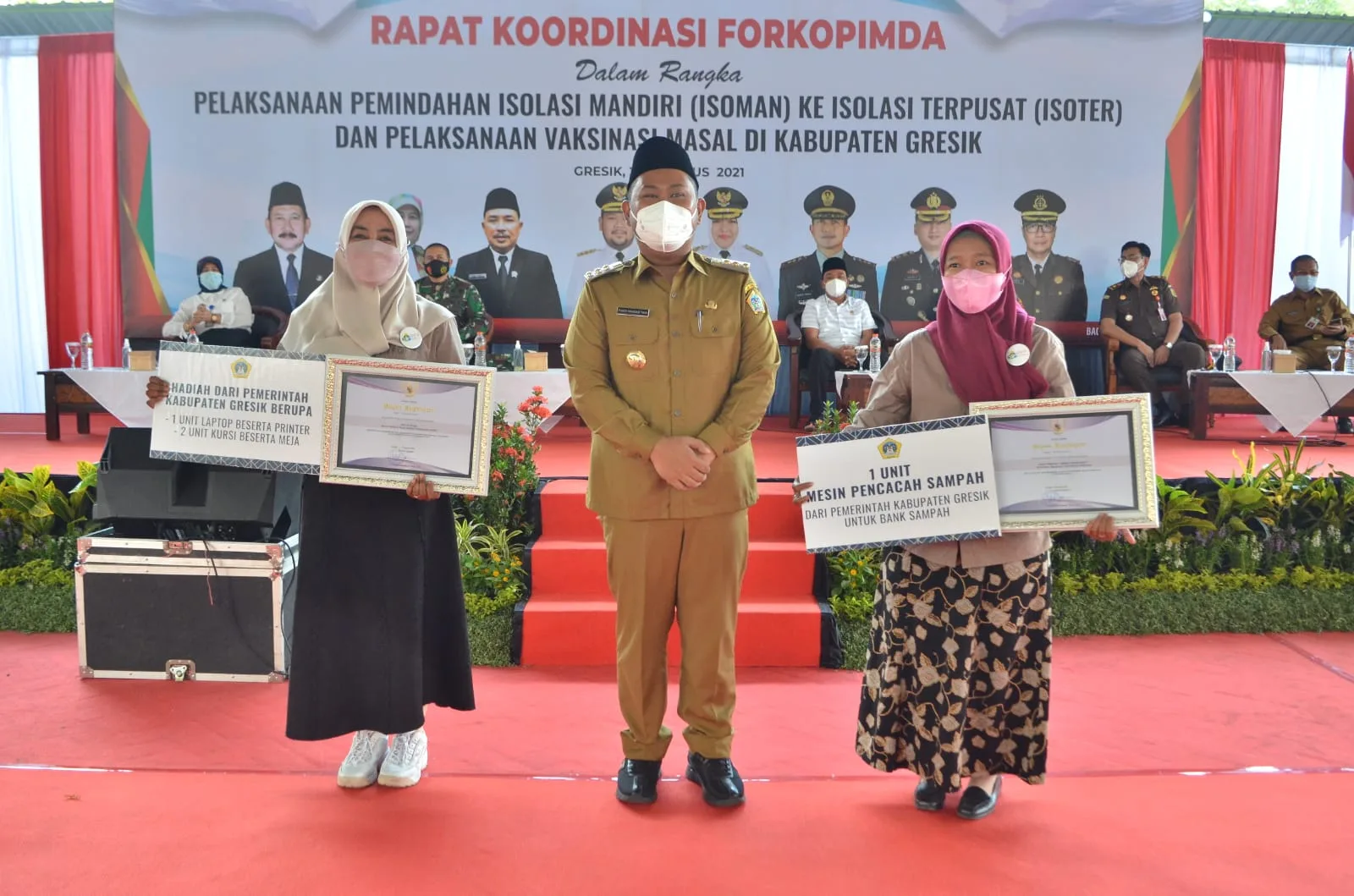 Penghargaan itu di serahkan secara simbolis di sela-sela Rakor Forkopimda di halaman parkir Pemkab Gresik (23/08). Reward yang di terima dua Kelompok bank sampah tersebut masing-masing seperangkat alat tulis seperti laptop, printer, meja, kursi, hingga alat pemecah sampah.
