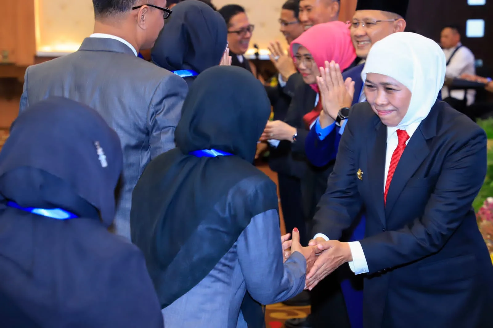 Gubernur Khofifah bersama rombongan disambut Ketua Umum BK3S Jatim Pinky Saptandari. Gubernur perempuan pertama di Jatim ini menyempatkan untuk bersapa, berbincang, dan memberi semangat kepada beberapa difabel peserta vaksin.