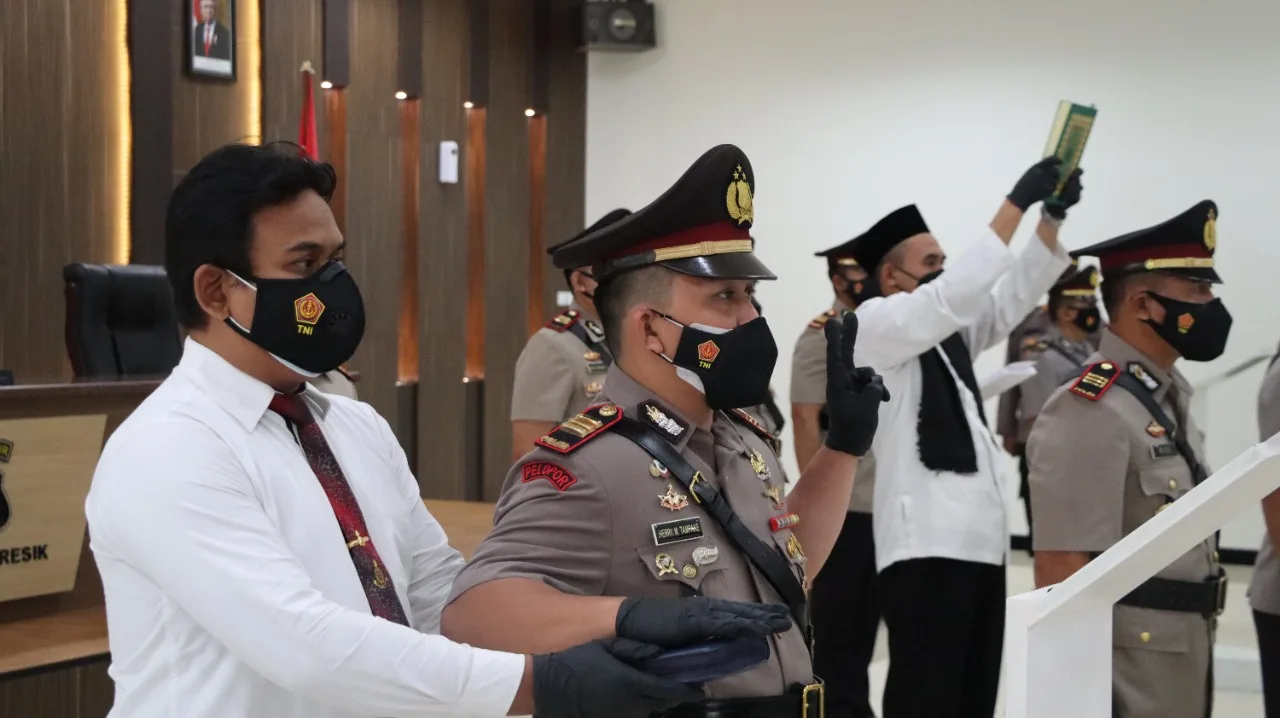 GRESIK-KEMPALAN : Kapolres Gresik AKBP Arief Fitrianto,SH,SIK,MM memimpin upacara serah terima jabatan (Sertijab) sejumlah pejabat utama (PJU) dan kapolsek jajaran,Penanganan Covid-19 masih jadi pesan utama yang harus dijalankan pejabat baru.Kamis(2-9-2021)