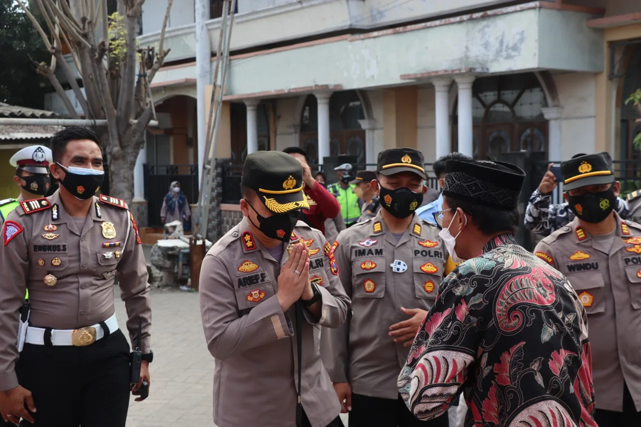 GRESIK-KEMPALAN : Kapolres Gresik AKBP Arief Fitrianto,SH,SIK,MM meninjau vaksinasi serentak pondok pesantren (Ponpes) dan rumah ibadah di Ponpes Metal, Desa Pongangan Manyar, Selasa (7/9/2021). 900 dosis vaksin disuntikkan dalam kesempatan tersebut.