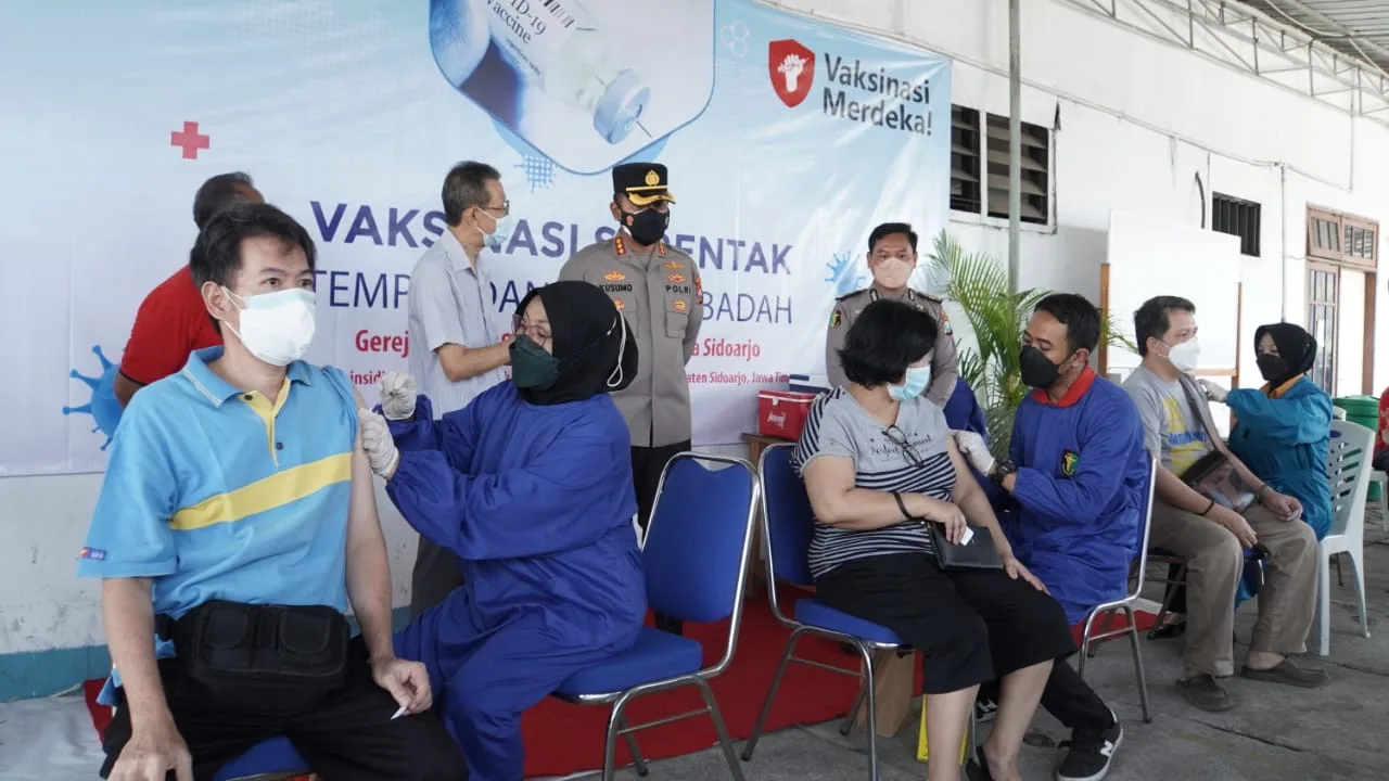 Seperti dilakukan Polresta Sidoarjo yang kembali menggelar vaksinasi serentak pesantren dan tempat ibadah, kali ini bertempat di Gereja Santa Maria Annuntiata, Jalan Monginsidi, Sidoarjo.