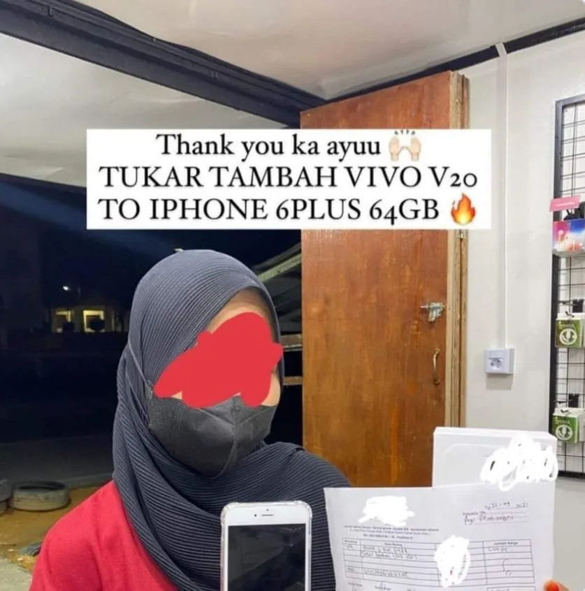 Di foto tersebut juga terdapat struk bertuliskan nama “Ayu Maharani,” tanggal transaksi 22 September 2021. Di struk tersebut juga tertulis deskripsi “iPhone 6 Plus 64GB tukar tambah Vivo V20”. Di foto tersebut juga ada keterangan tulisan “Thank You ka Ayu, Tukar tambah vivo V20 to iPhone 6 Plus 64GB”.