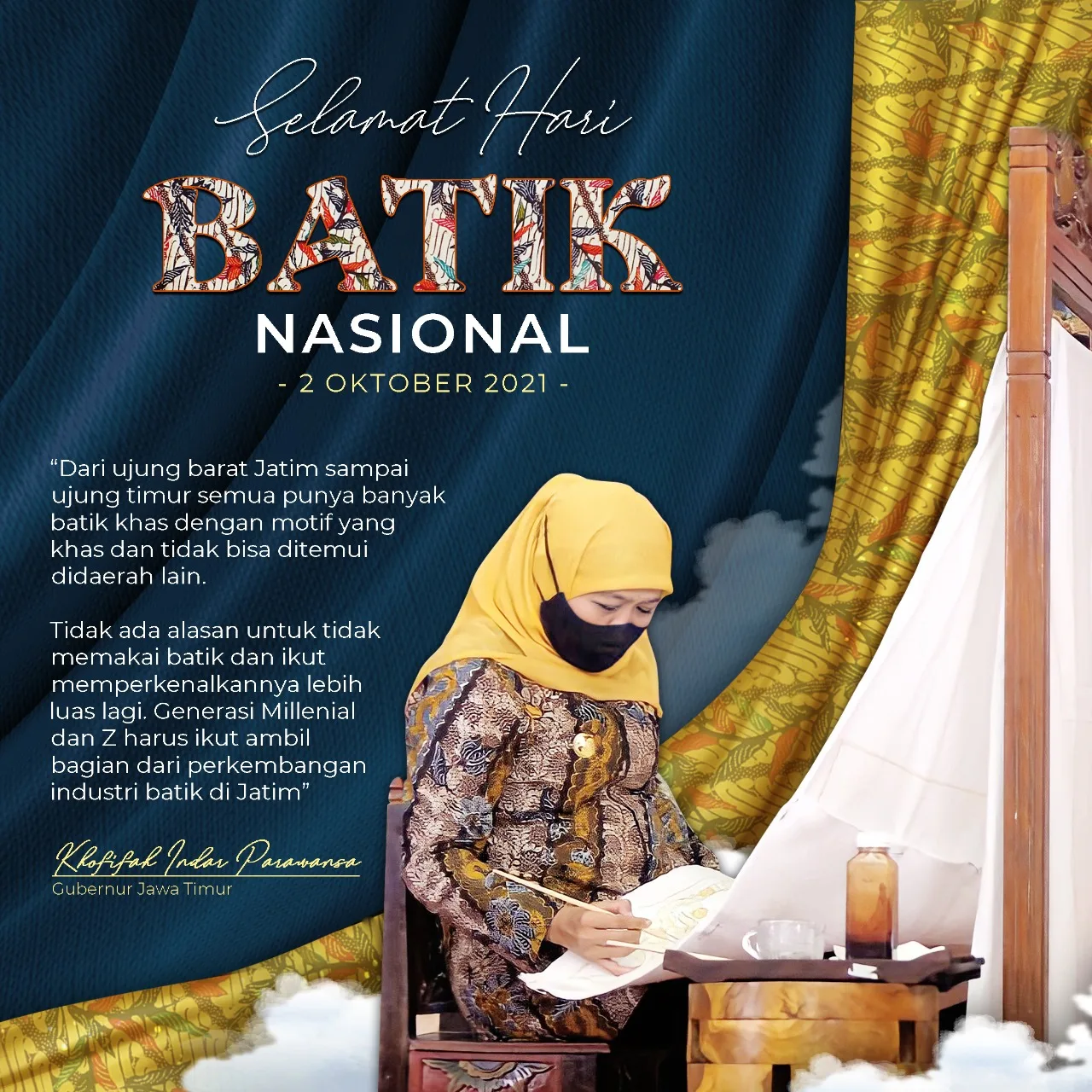 “Hari Batik, jangan hanya ramai di medsos atau hashtag saja, tapi juga ramaikan di gerai-gerai batik. Di Jatim ini banyak sekali sentra batik dengan beragam motif sesuai ciri khas daerahnya. Mulai dari Tuban, Banyuwangi, Madura, Ponorogo, Tulungagung, Trenggalek, Mojokerto, Pacitan, Sidoarjo, Bojonegoro, Jember dan sebagainya. Ayo bantu perajin batik di Jatim bisa tetap eksis dengan membeli produknya,” ungkap Khofifah di Bandara Juanda, Surabaya sebelum take off menuju Jayapura, Sabtu (2/10).