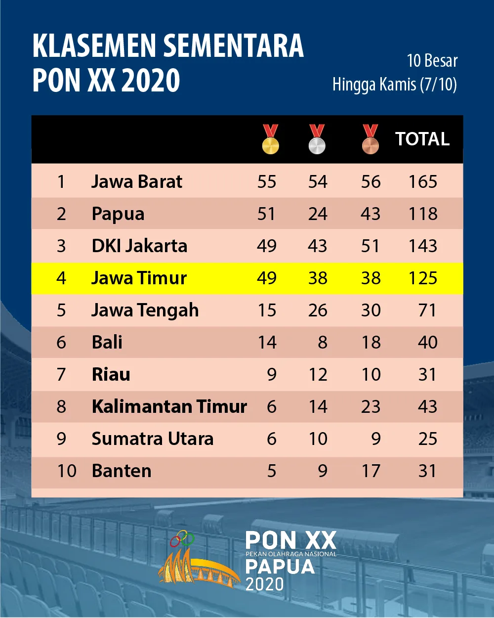 Perolehan Medali Sementara di PON XX Papua