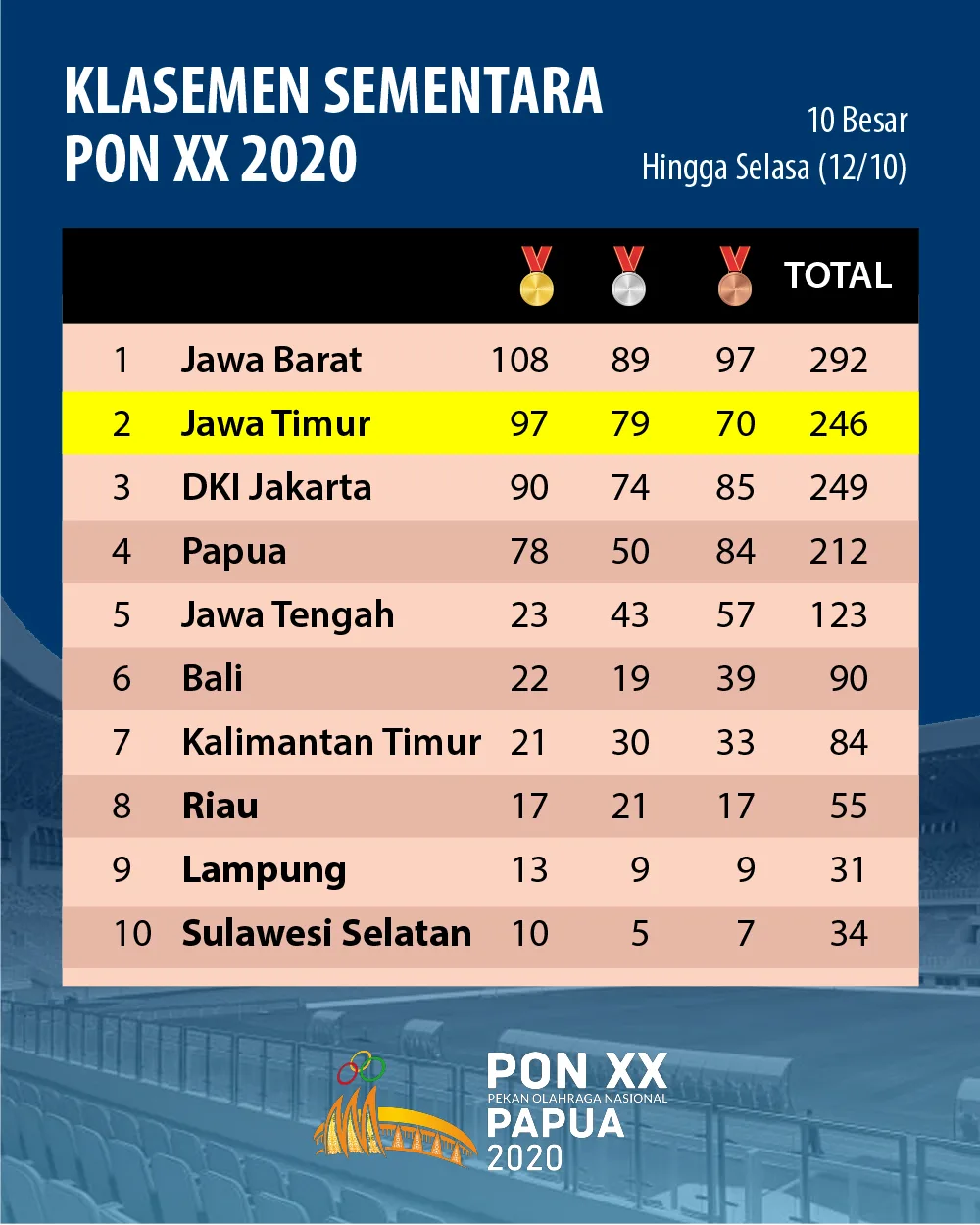 Perolehan Medali Sementara PON XX Papua