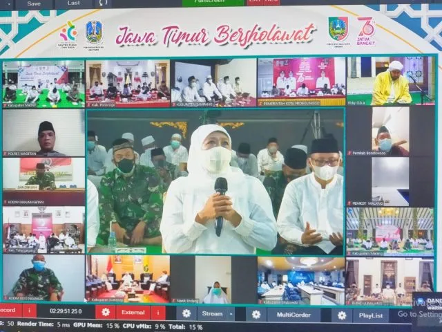 JOMBANG-KEMPALAN: Bertepatan dengan Hari Jadi ke-76 Provinsi Jawa Timur, Hari Jadi ke-111 Pemkab Jombang dan Hari Santri Nasional, Gubernur Jawa Timur Khofifah Indar Parawansa bersama Bupati/Walikota se-Jatim mengikuti Jawa Timur Bersholawat yang digelar secara hybrid dari Pendopo Kabupaten Jombang, Selasa (12/10) malam.