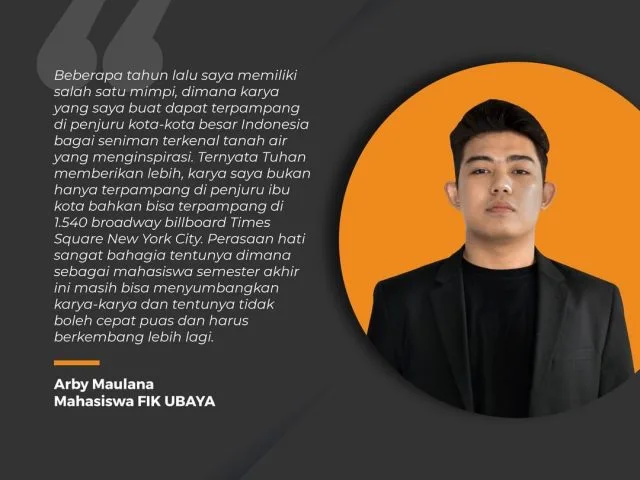 Arby mengungkapkan, karyanya ditampilkan pada akhir Oktober. “Beberapa tahun lalu saya memiliki salah satu mimpi, karya yang saya buat dapat terpampang di penjuru kota-kota besar Indonesia bagai seniman terkenal Tanah Air yang menginspirasi, ternyata Tuhan memberikan lebih, karya saya bukan hanya terpampang dipenjuru ibu kota, bahkan bisa terpampang di 1540 Broadway Billboard Times Square New York city. Perasaan hati sangat bahagia tentunya di mana sebagai mahasiswa semester akhir masih bisa menyumbangkan karya dan tentunya tidak boleh cepat puas dan harus berkembang lebih lagi,” tutur Arby.