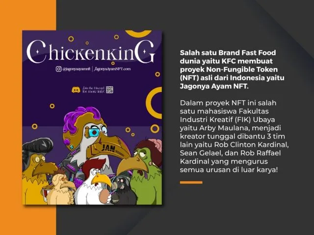 Karya dari mahasiswa semester akhir itu bekerja sama dengan KFC Indonesia dalam project NFT KFC, yaitu Jagonyaayam NFT tampil di 1540 Broadway Billboard Times Square New York dan juga tampil di beberapa billboard spot di Jakarta!