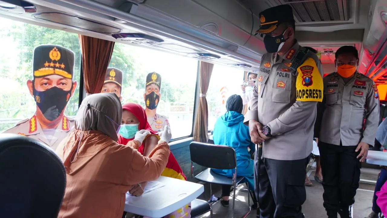 Tampak pula Kapolresta Sidoarjo Kombes Pol. Kusumo Wahyu Bintoro menghampiri pengendara, sekedar mengingatkan patuhi peraturan tertib lalu lintas dan tetap memakai masker. Sedangkan di sisi lain, berlangsung vaksinasi Covid-19 bagi masyarakat dan pembagian baksos sembako.