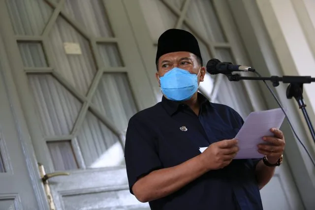 KAB BANDUNG-KEMPALAN: Bupati Bandung Dadang Supriatna mengucapkan bela sungkawa yang mendalam atas wafatnya Wali Kota Bandung Oded M Danial, di Masjid Raya Mujahidin Kota Bandung, Jumat (10/12/21).