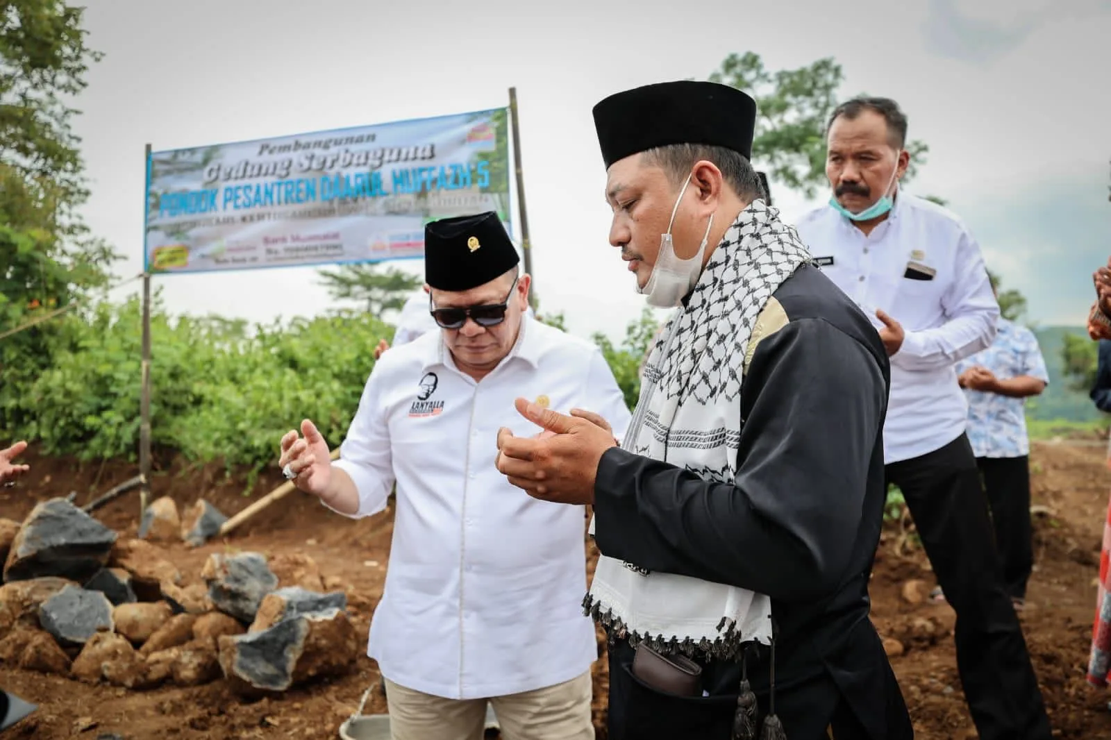 PASURUAN – KEMPALAN: Ketua DPD RI, AA LaNyalla Mahmud Mattalitti, melakukan peletakan batu pertama pembangunan Gedung Serbaguna Pondok Pesantren Daarul Huffazh 5, Purwosari, Pasuruan, Rabu (29/12/2021).