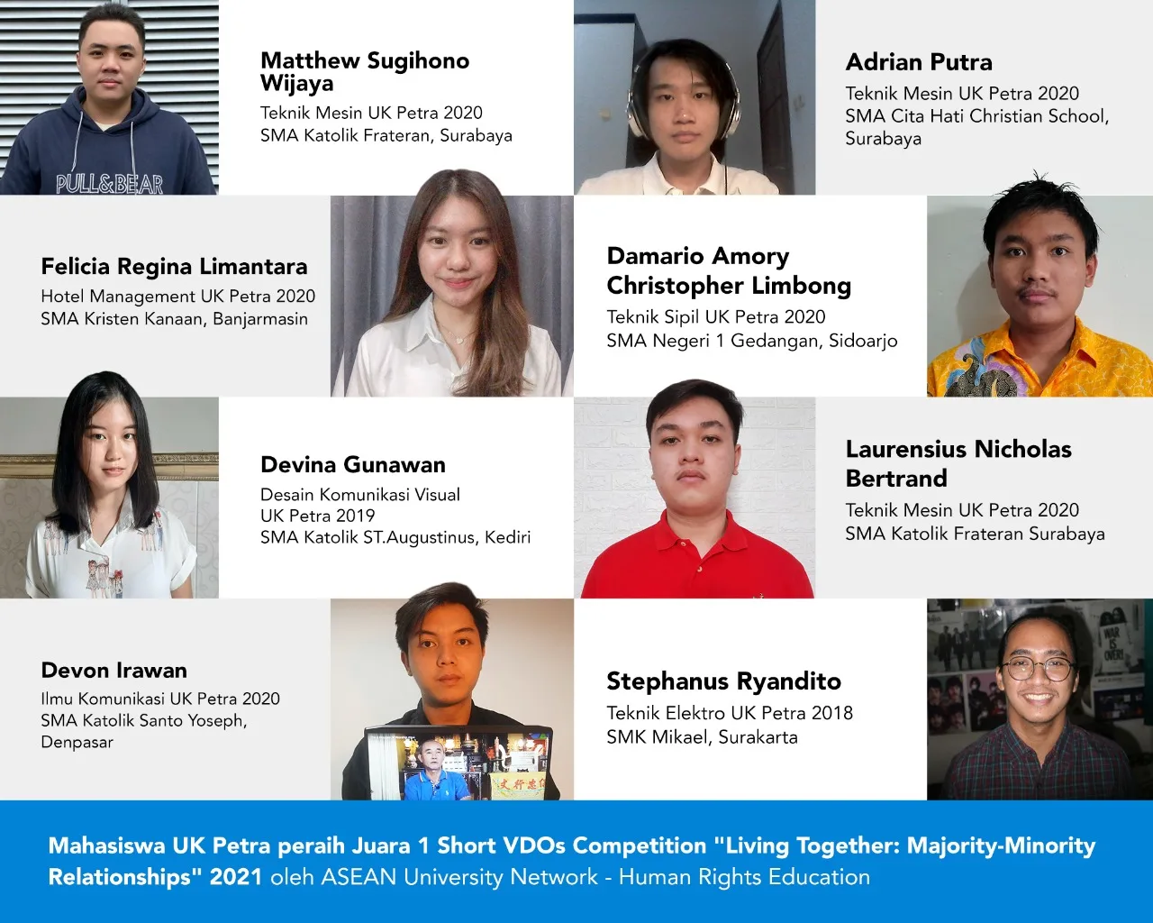 Mengangkat tema “Living Together: Majority-Minority Relationships”, lomba video pendek yang diadakan oleh ASEAN University Network, Human Rights Education (2021 short VDOs Competition) pada Desember 2021 lalu itu mengasah kreativitas mahasiswa dengan memperhatikan keberagaman yang dimiliki suatu bangsa.