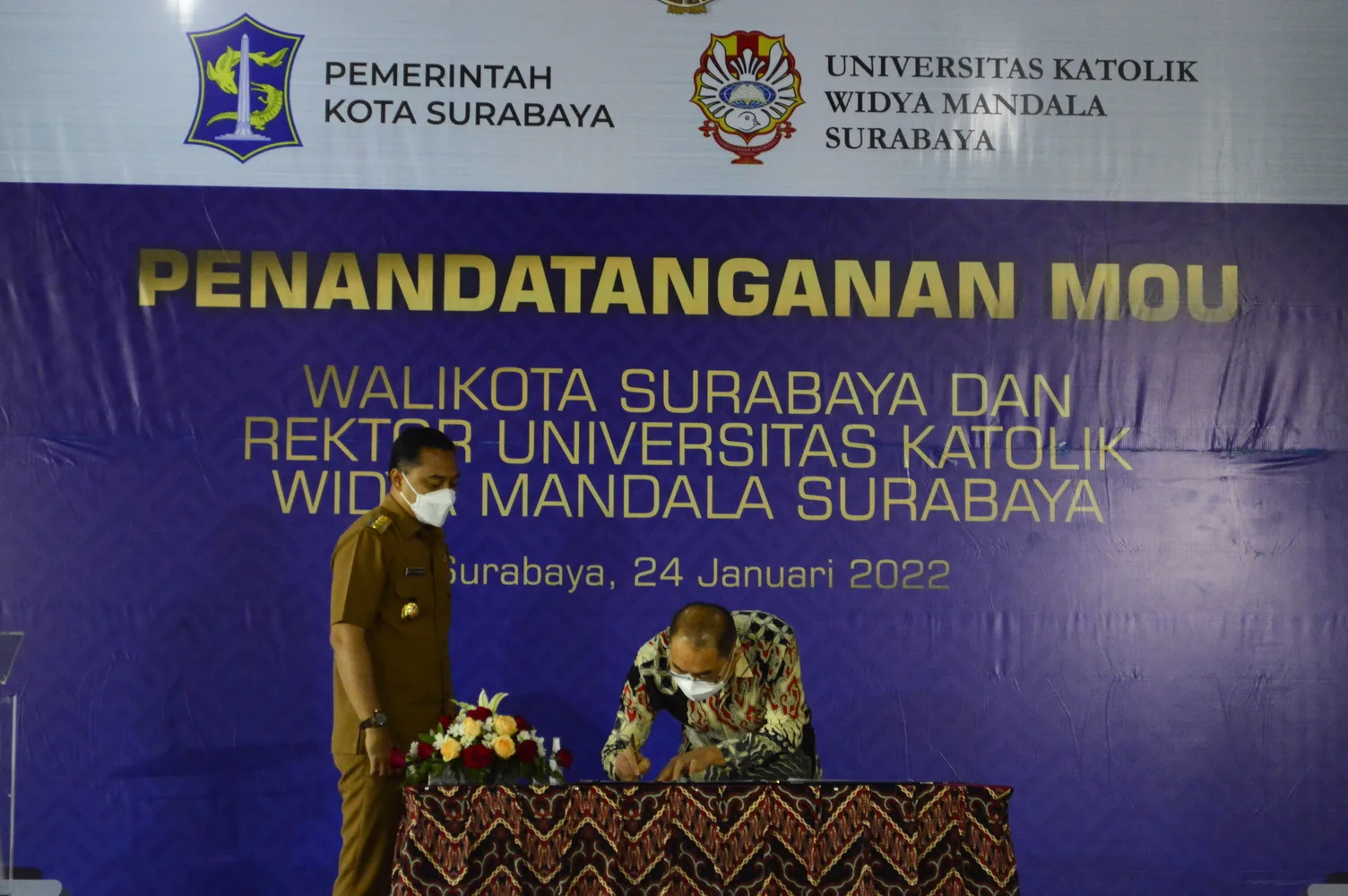 SURABAYA–KEMPALAN: Untuk mewujudnyatakan komitmen dalam berkontribusi bagi pegiat Usaha Mikro, Kecil dan Menengah (UMKM) di kota Surabaya, dibutuhkan kolaborasi yang erat. Maka itu, Universitas Katolik Widya Mandala Surabaya (UKWMS) berkolaborasi dengan Pemerintah Kota Surabaya. Momen ini dikukuhkan dalam Penandatanganan MoU di Lobby Auditorium UKWMS Kampus Pakuwon City secara hybrid pada Senin (24/1). Penandatanganan dihadiri oleh Eri Cahyadi, S.T., M.T., Wali Kota Surabaya dan Drs. Kuncoro Foe, G.Dip.Sc., Ph.D., Apt., Rektor UKWMS.
