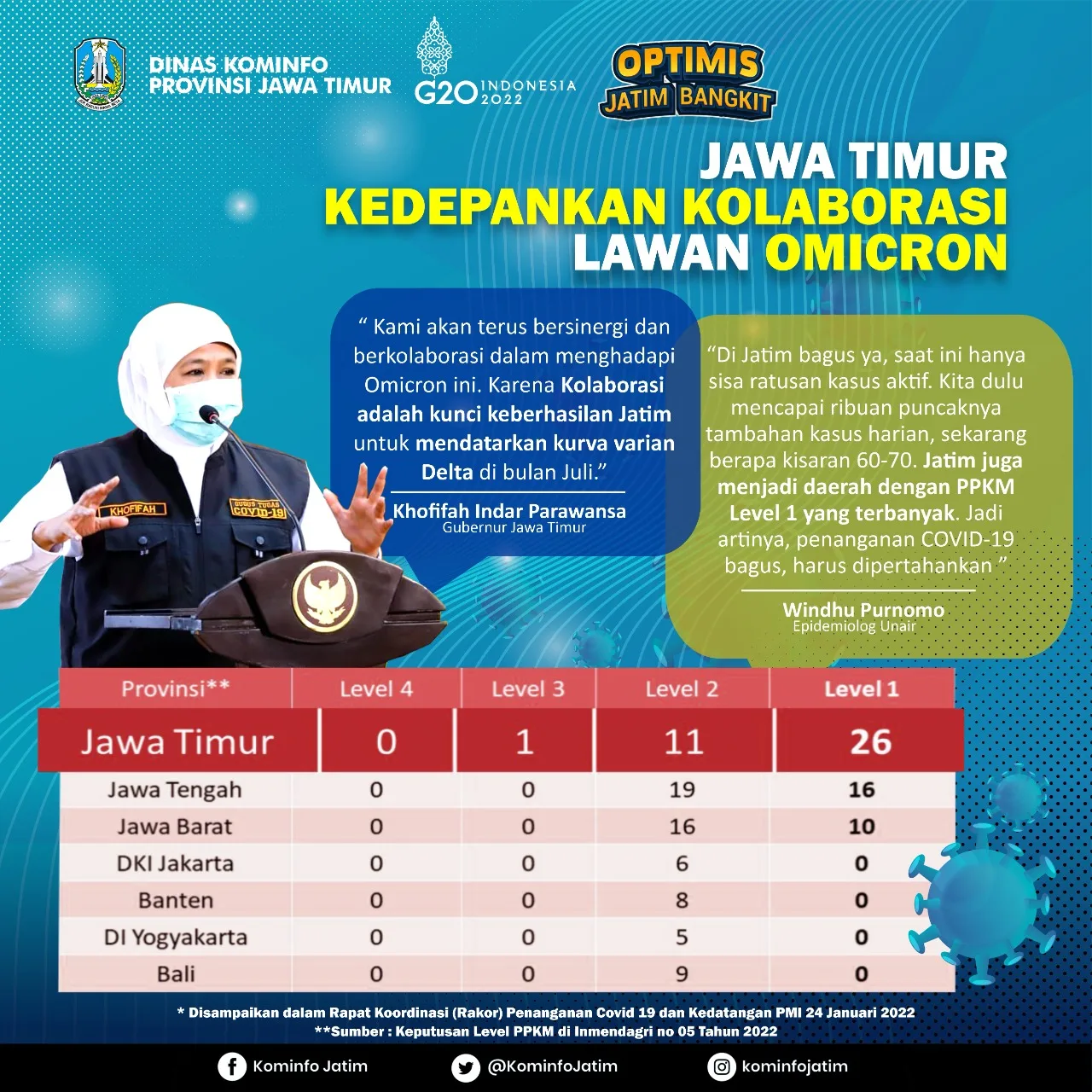 SURABAYA-KEMPALAN: Epidemolog Dr. Windhu Purnomo dalam paparannya di Rakor Kordinasi COVID-19 Bersama dengan Forkopimda memuji langkah penanganan penyebaran covid-19 varian B.1.1.529 (omicron) di Jawa Timur. Pujian tersebut diberikan atas hasil assessment situasi Covid-19 yang dirilis oleh Kementerian Kesehatan (Kemenkes) RI per 21 Januari 2022 yang menunjukan 8 indikator penentunya, Jatim masuk dalam kategori memadai dan menjadi yang terbaik dengan Kabupaten dan Kota yang masuk level 1 paling banyak di Indonesia.