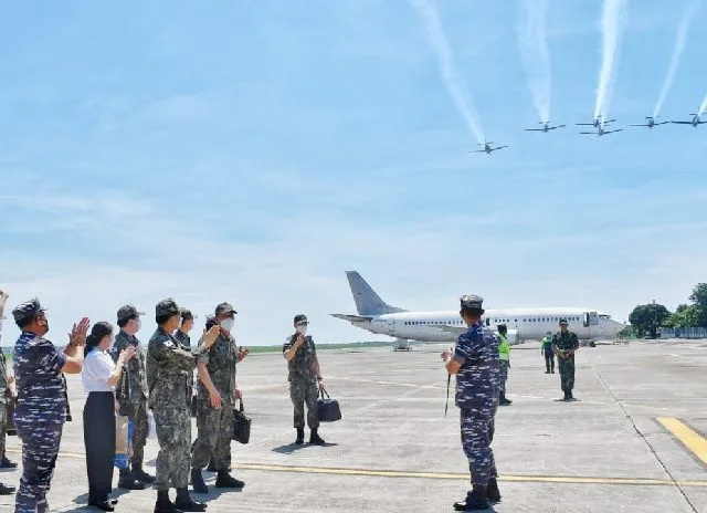 SIDOARJO-KEMPALAN: Chief of Naval Operation Republic of Korea Navy (Kasal Korea Selatan/Korsel) Admiral Kim Jung-Soo Selasa (22/2), pagi mendarat di Pangkalan Udara Angkatan Laut Juanda dengan menggunakan pesawat CN-235 milik TNI Angkatan Laut.