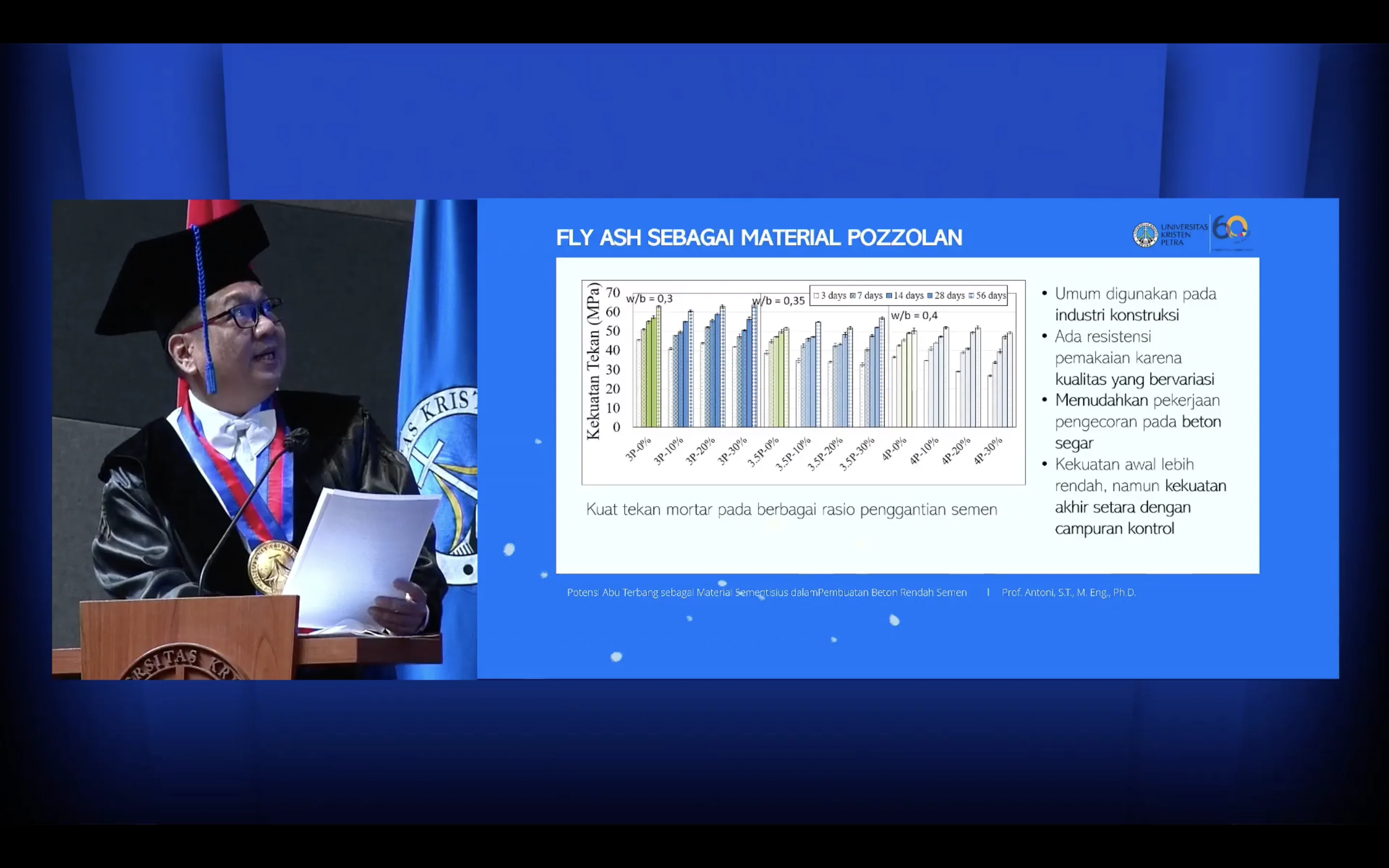 Fokus riset Prof. Antoni yaitu “Potensi Abu Terbang Sebagai Material Sementisius dalam Pembuatan Beton Rendah Semen”. Menurutnya Beton di Indonesia yang ada selama ini hanya memanfaatkan Fly Ash sebanyak 20-30% saja untuk menggantikan semen, padahal jumlah ini masih bisa di tingkatkan kembali bahkan hingga 100% tanpa efek buruk pada betonnya.