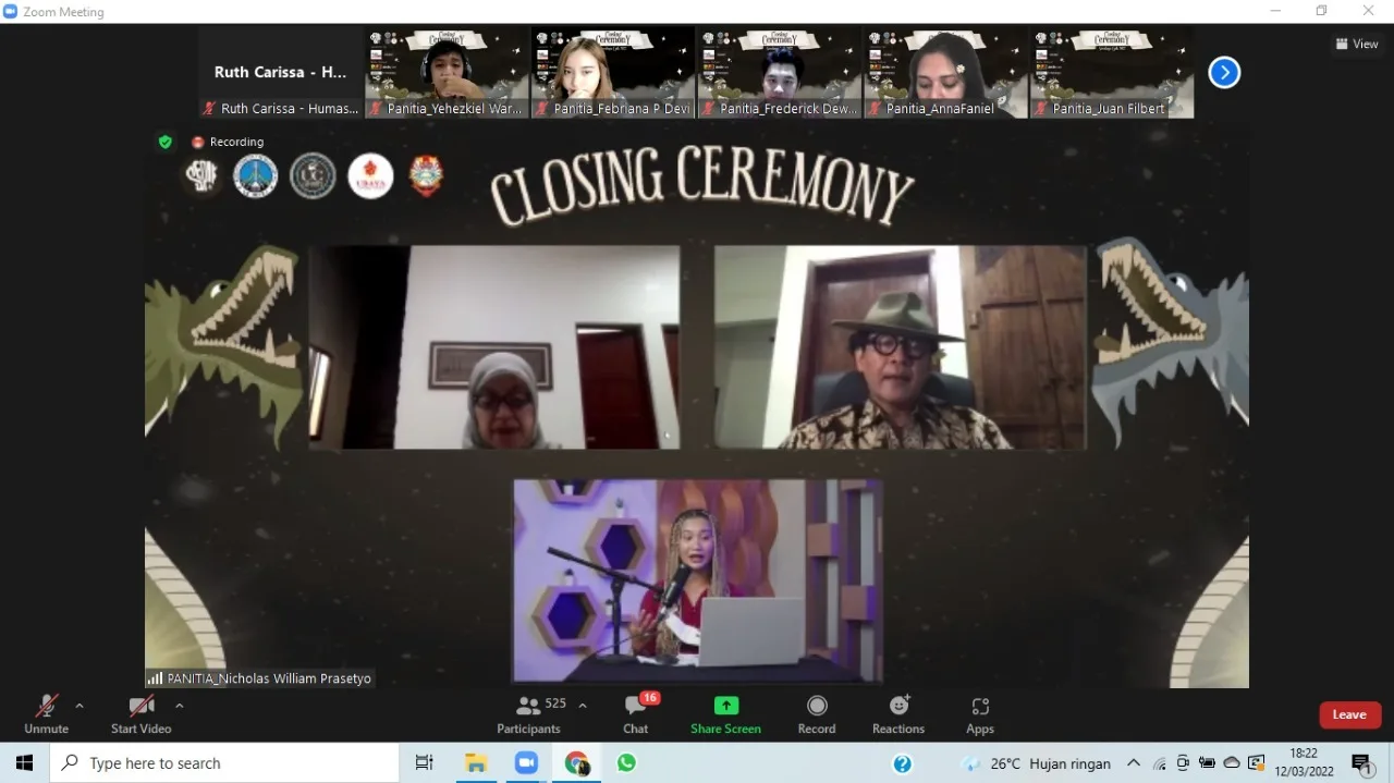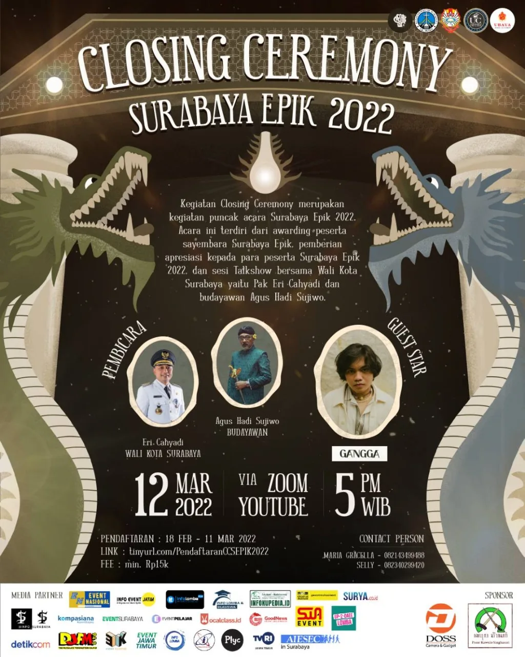 Puncak acara Closing Ceremony SEPIK 2022 akan mengusung tema “Malam Semarak Arek Surabaya Epik”, dimana kegiatan ini akan dilaksanakan melalui media ZOOM dan akan ditayangkan live melalui YouTube pada Sabtu, 12 Maret 2022 pukul 17.00 WIB.