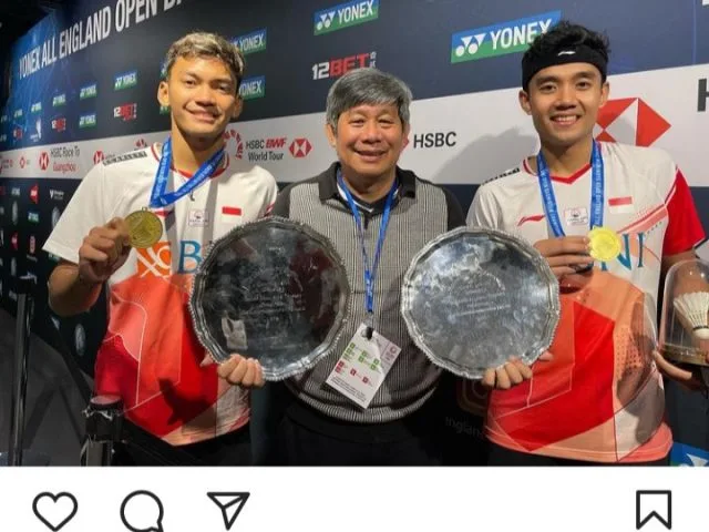 Sembari berfoto dengan Bagas/Fikri yang sedang berkalung medali emas All England 2022, Herry IP menyebut dua anak asuhnya itu sebagai ‘Amazing Young Player” atau pemain muda luar biasa.